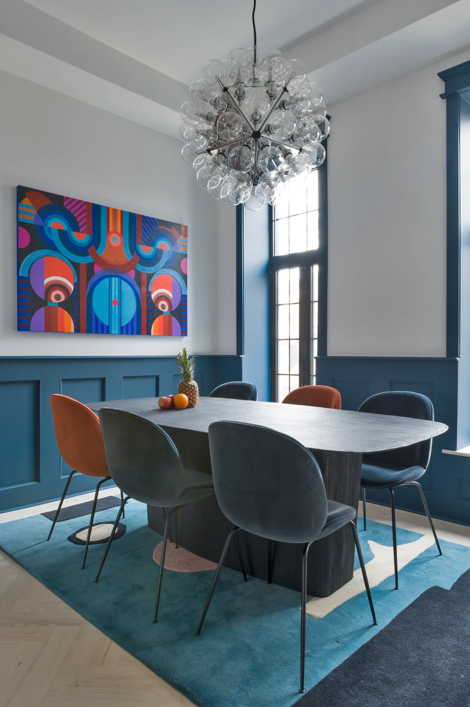The layout of the living area was maintained open to allow natural light in from the opposite sides of the façade throughout the whole day, enhancing the perception of the rare high ceiling of the original construction. The first perspective that opens up from the Entry Vestibule is a welcoming Dining Room where the color tones of the textiles and the geometries of the chandelier are in dialogue with the original painting by the client, Jenny Chow, entitled Party of six, which depicts an abstract lively dining scheme amongst a group of sic actively engaging in a conversation over great food and wine.