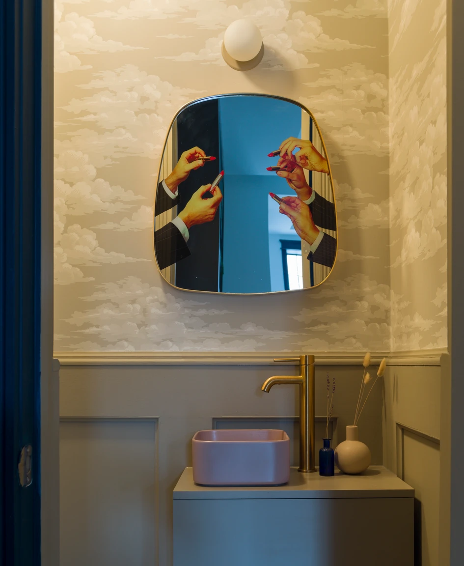 The elegant blue of the panelings wraps around the whole Parlor level holding together the colorful accents and toning down the light to guarantee a feeling of calmness. It also frames the door of the Powder Room, where the cloudy wallpaper, funky mirror and spherical lights create a suspended environment. In the Master Bedroom the original brick are the protagonists, while the rounded edges of the furniture and of the valchromat built-in night stands create a sense of fluidity and relax.