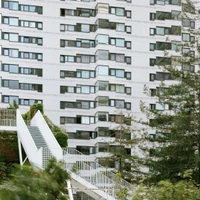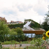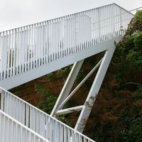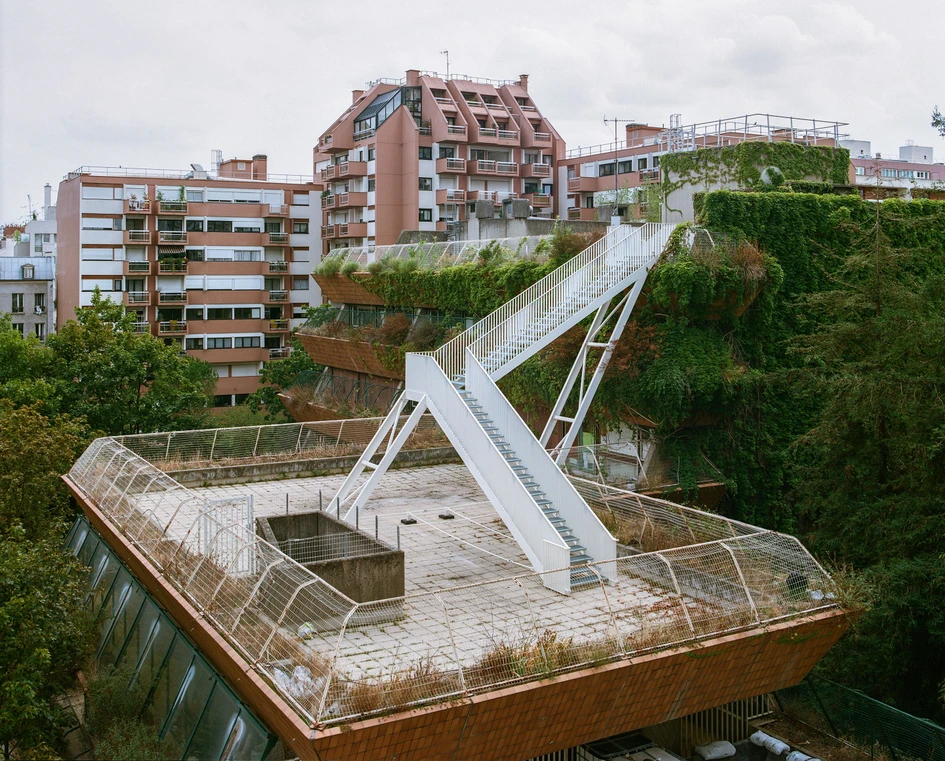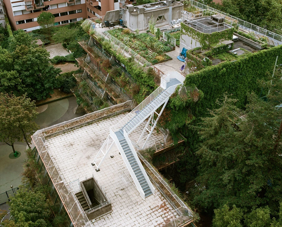 Among the vertical landscape of the towers of the 13th arrondissement of Paris, a local urban agriculture association is developing its activity on the roofs of the Dunois school group. Linking two previously separate spaces, a two-flight staircase emerges from a school whose facades have been overgrown with vegetation. The white powder-coated staircase's simple form fits into a heterogeneous environment.