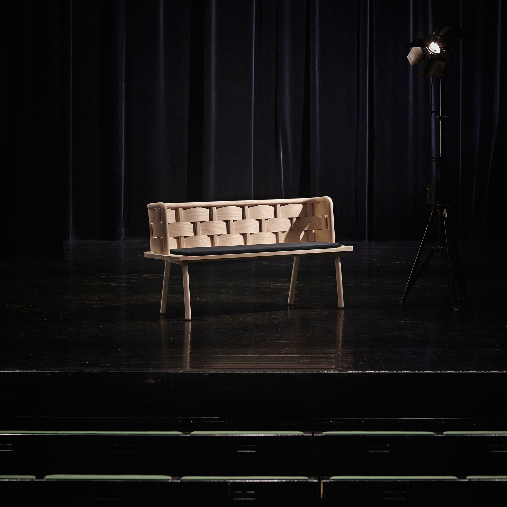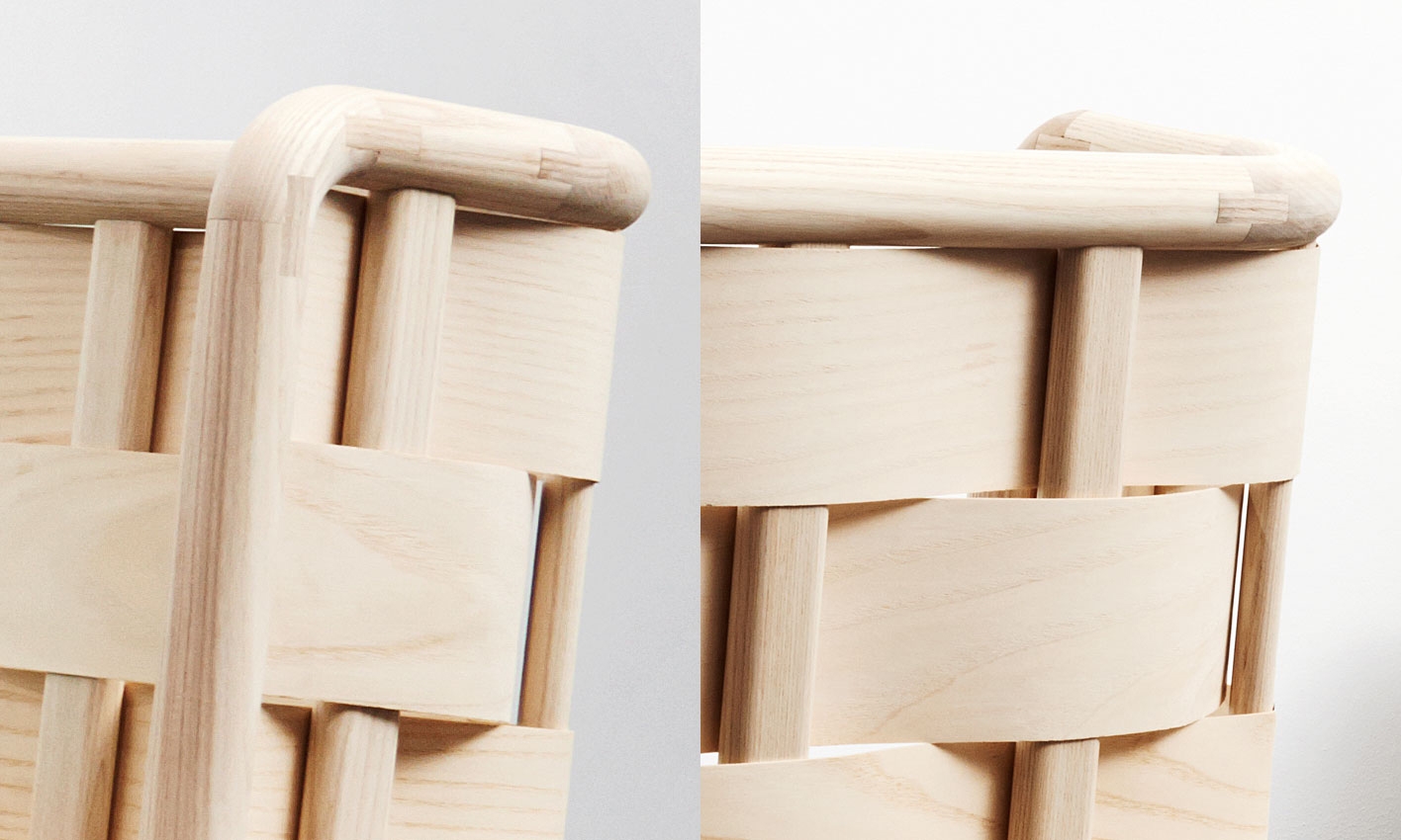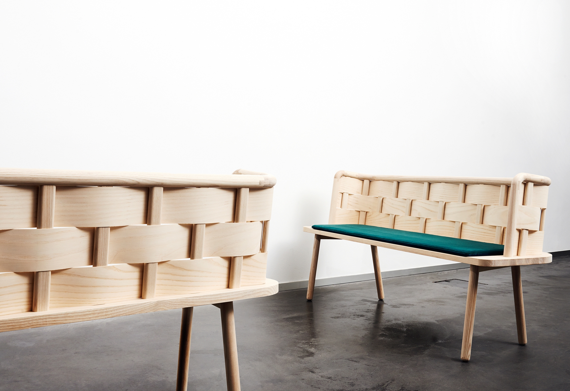 The use of plywood for the back of the bench enabled us to create a strong back without having to go through the process of molding the wood. The idea was based on basket weaving techniques which were enlarged and simplified in the design. The processing and quantity of the material is reduced by working on a larger scale while creating a simple aesthetic and organic form.