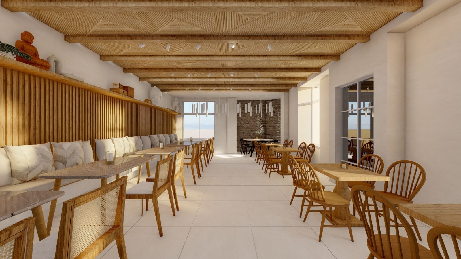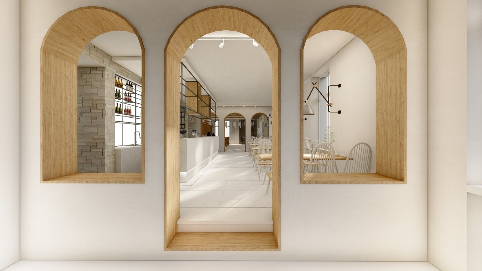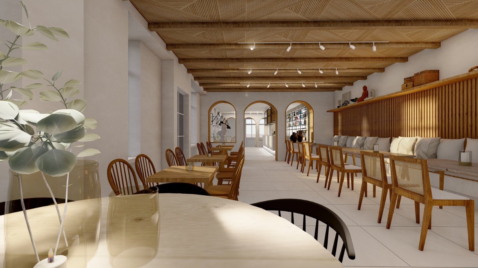 Curved windows and central entrance are welcoming the visitor of this traditional restaurant that, through the material used, reminds of an easy-go architecture without exaggerations.