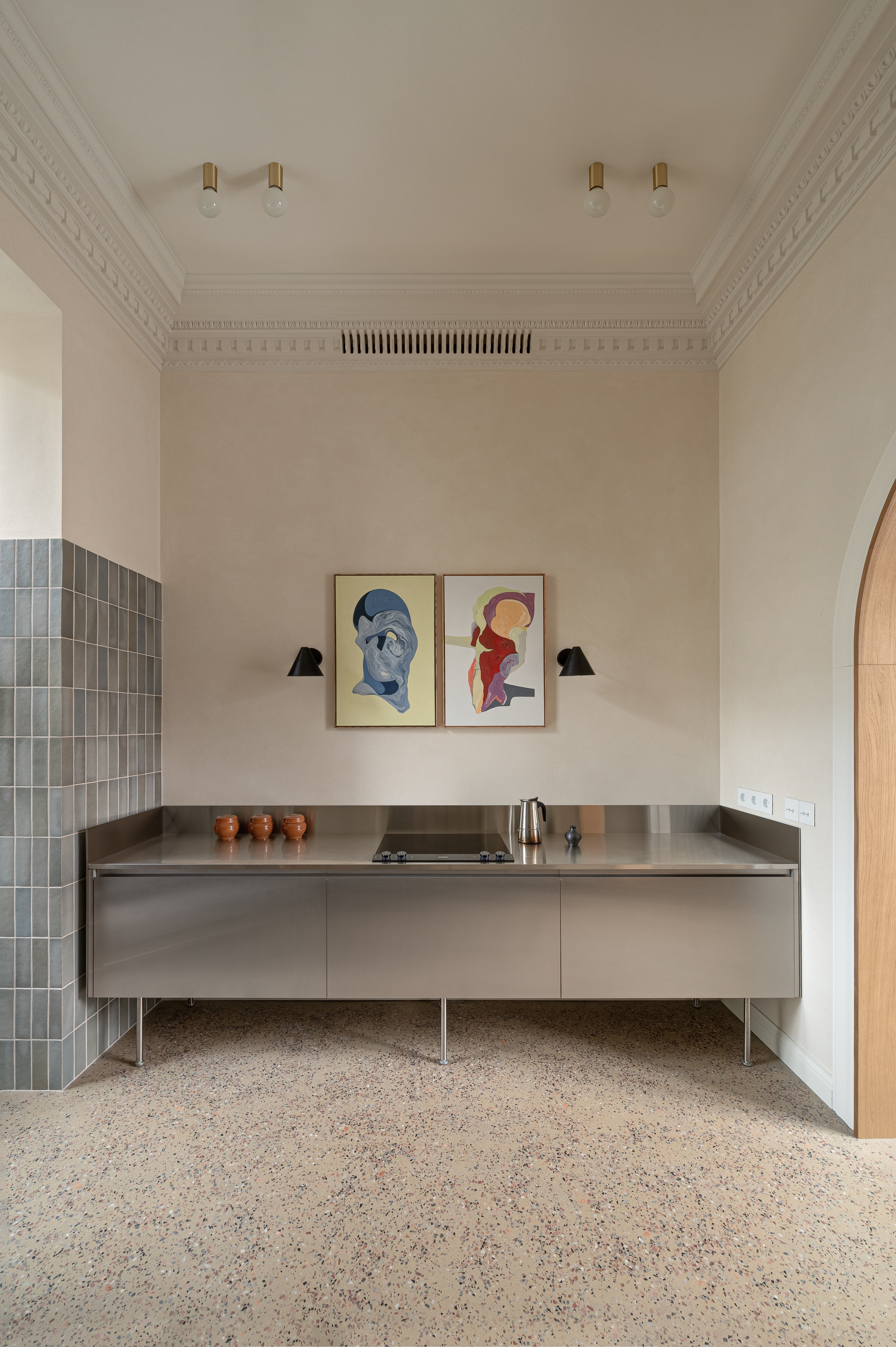 The apartment's distinctive features, including the spacious corridor-gallery with its windows and arches, a loggia, and a balcony, served as the cornerstone of the project's concept. The corridor, acting as the central artery, extends throughout the entire apartment, seamlessly integrating all areas into a cohesive space. Enhanced arches exude sophistication, achieved through the fusion of decorative molding and an inner wooden frame. The loggia underwent insulation and was seamlessly incorporated into the kitchen, where a conservatory for plants was thoughtfully placed.