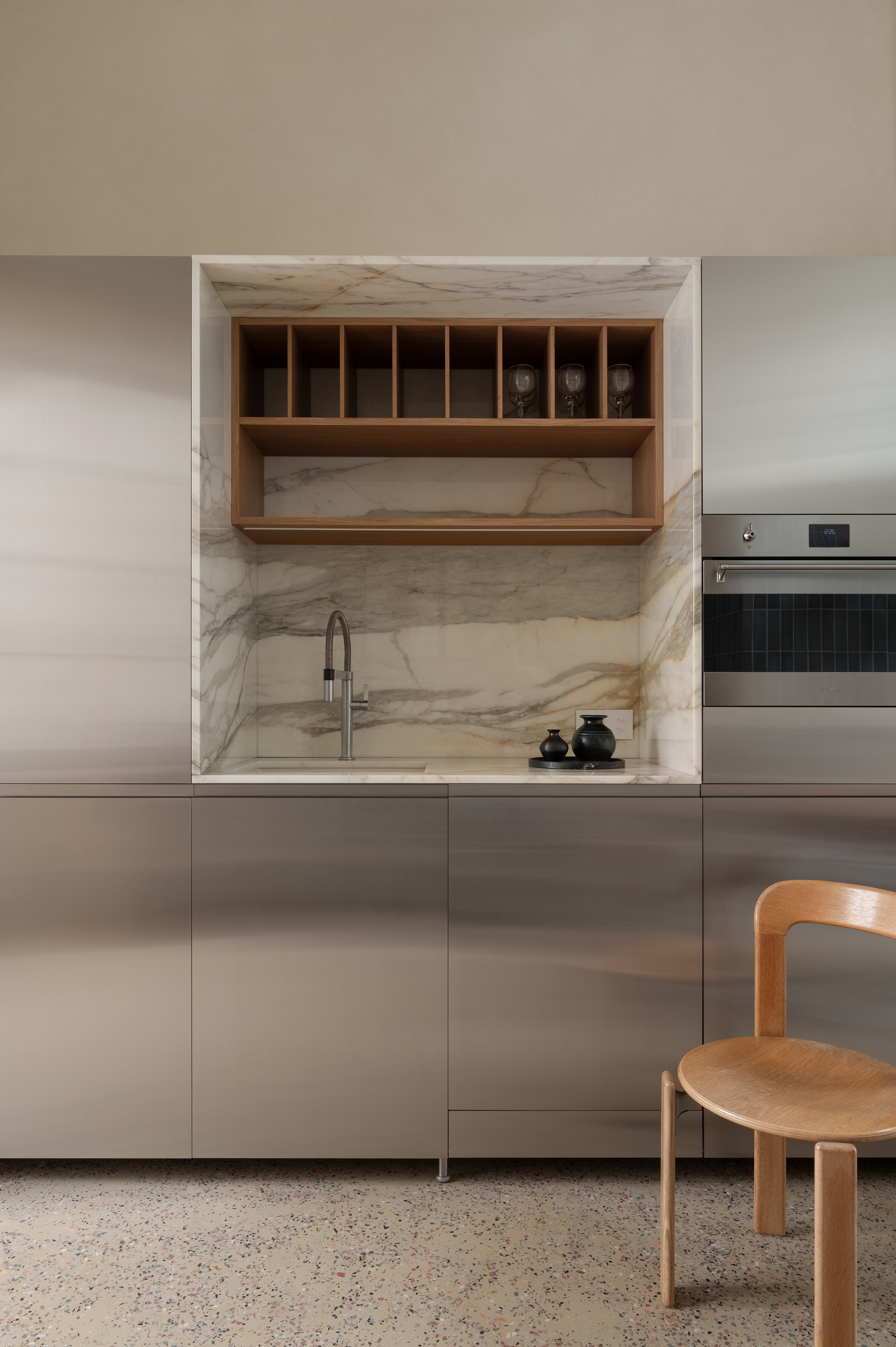 To cultivate a sense of stability and tranquility, materials such as toned oak, marble, stainless steel, and brass were meticulously selected. Experimentally, sand was incorporated into the terrazzo flooring, while marble chips were embedded within mineral plaster on the walls, enhancing their texture and visual appeal.
