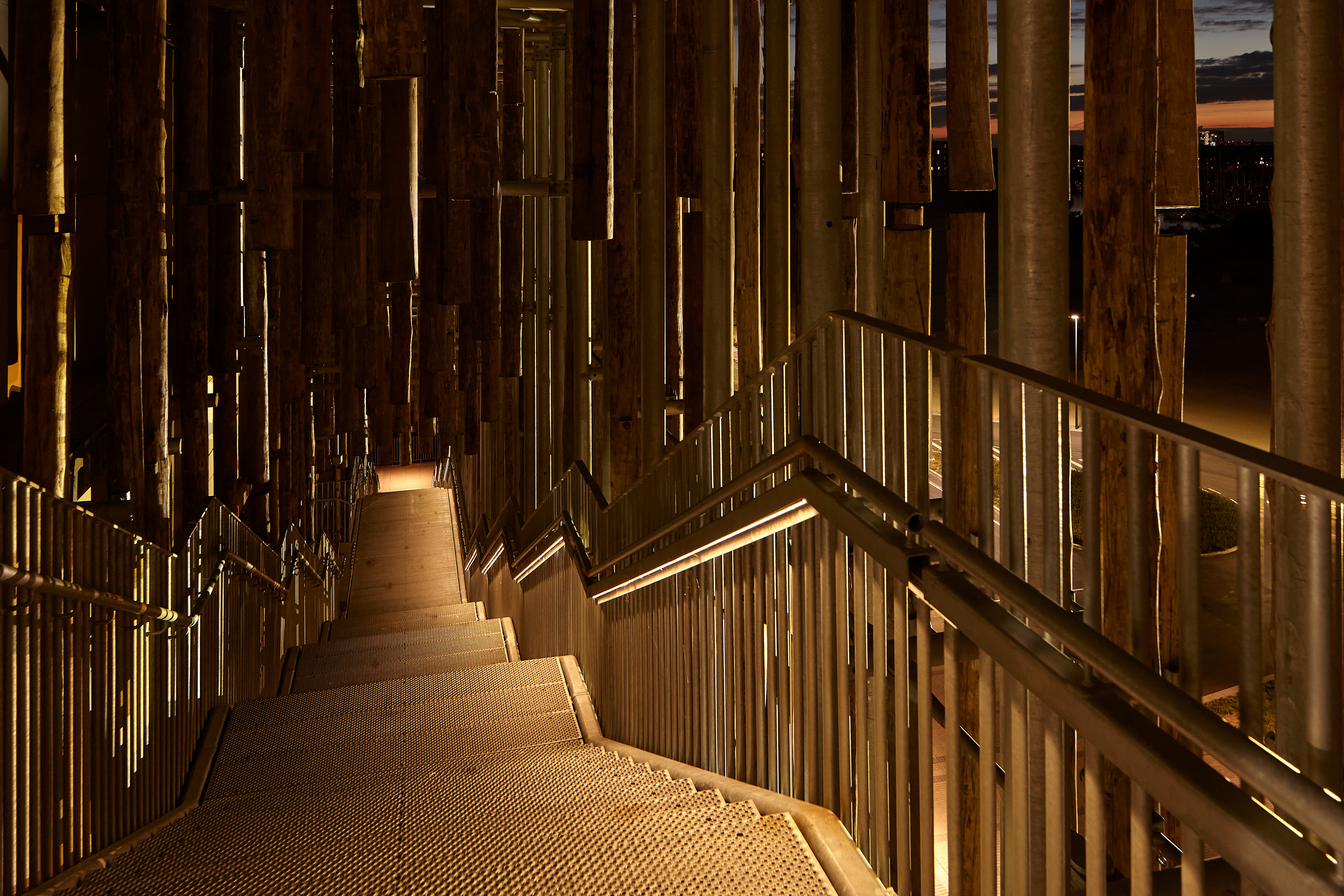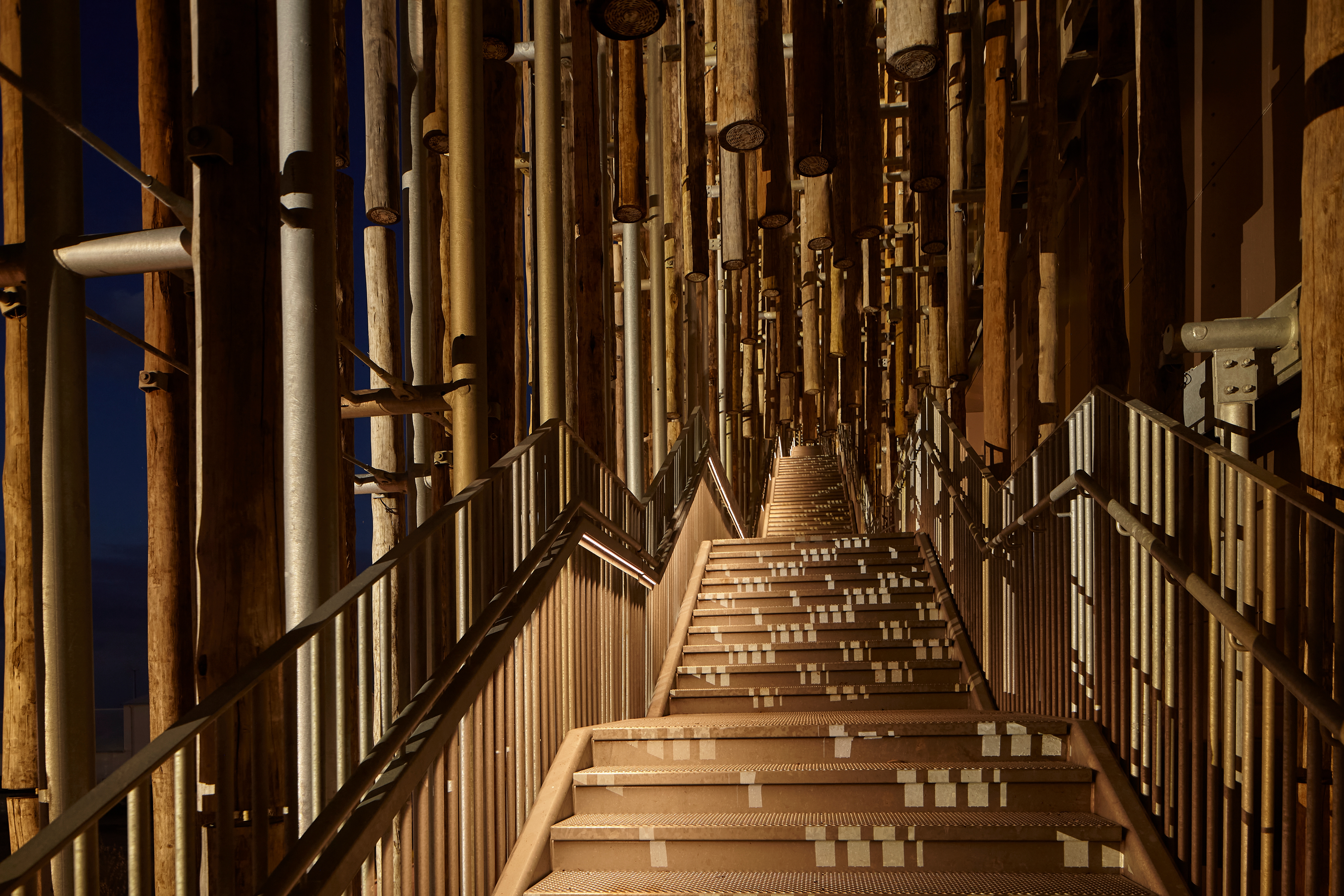 From a platform beneath the façade, a staircase leading to a viewing platform cuts through the main façade of the powerplant. Ascending the stairs, the experience is one of moving through a luminous forest. By day natural light creates beautiful shadow play through the trunks of the trees. As darkness falls, layers of projected light projected shift in speed, focus and intensity, casting patterns of light and shadow that never appear the same way twice. Sandwiched in the façade and immersed in dappled light, the sensation is of having entered a remarkable alternate reality - juxtaposed against the night and the urban powerplant context.