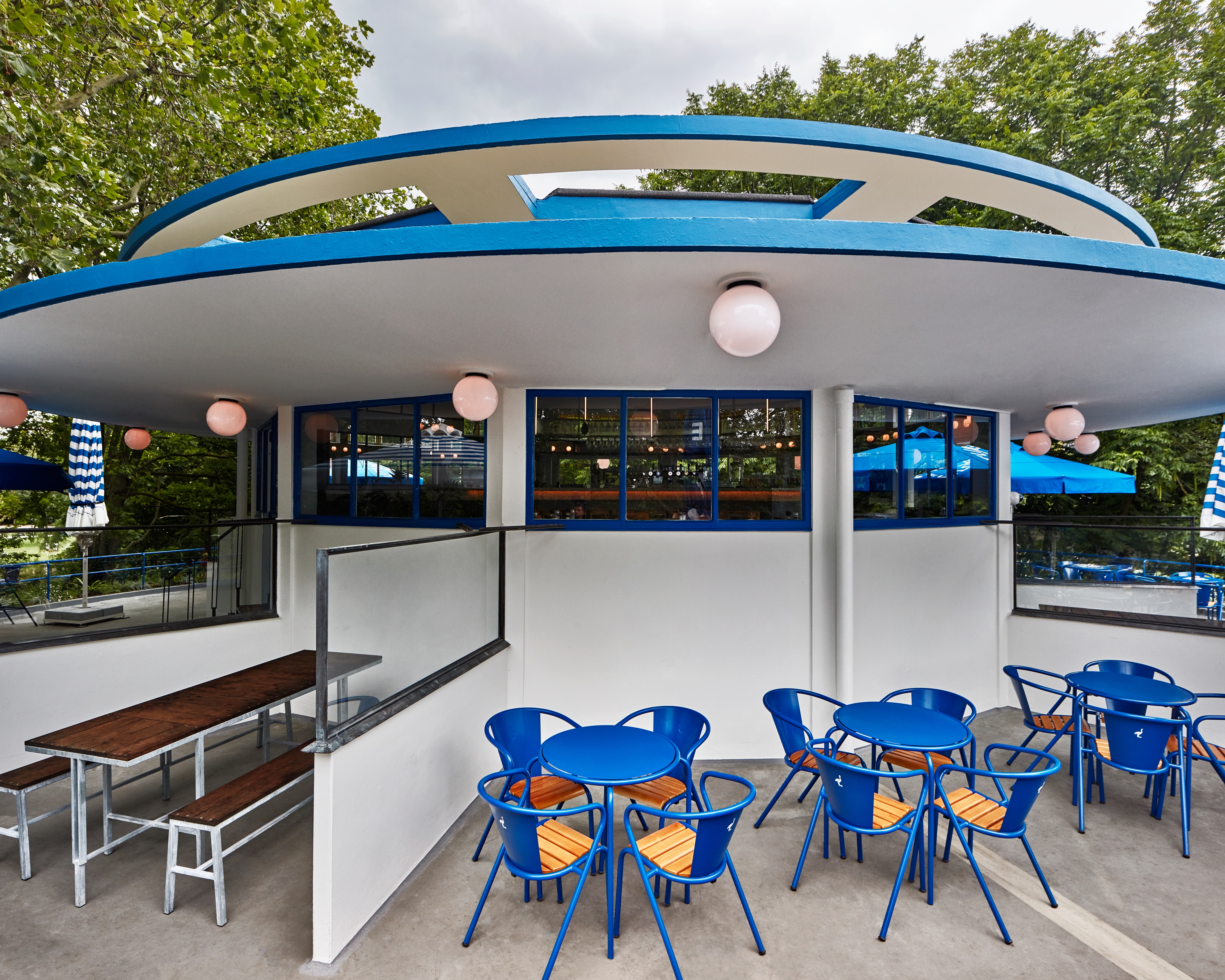 To enforce the unique character of the location, Studio Modijefsky also sourced a special type of outdoor steel chair and lounger, never before used in Amsterdam. The monumental inky shade of blue, so characteristic for Blauwe Theehuis is combined with a small, white Brouwerij ‘t IJ logo of an ostrich, forming a new identity reminiscent of Parisian parks.