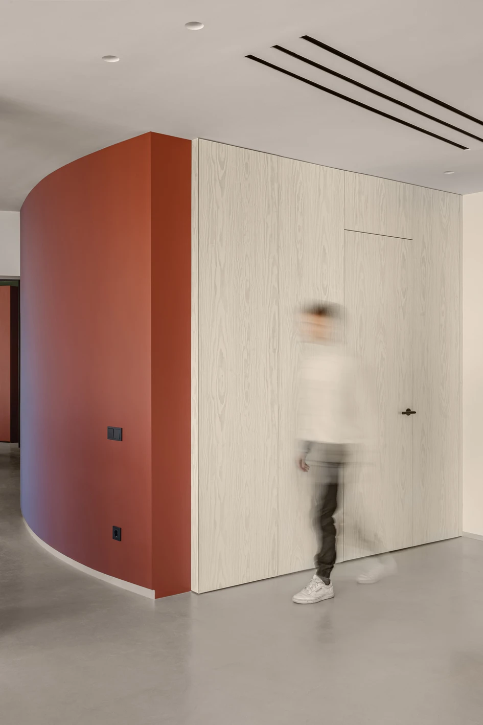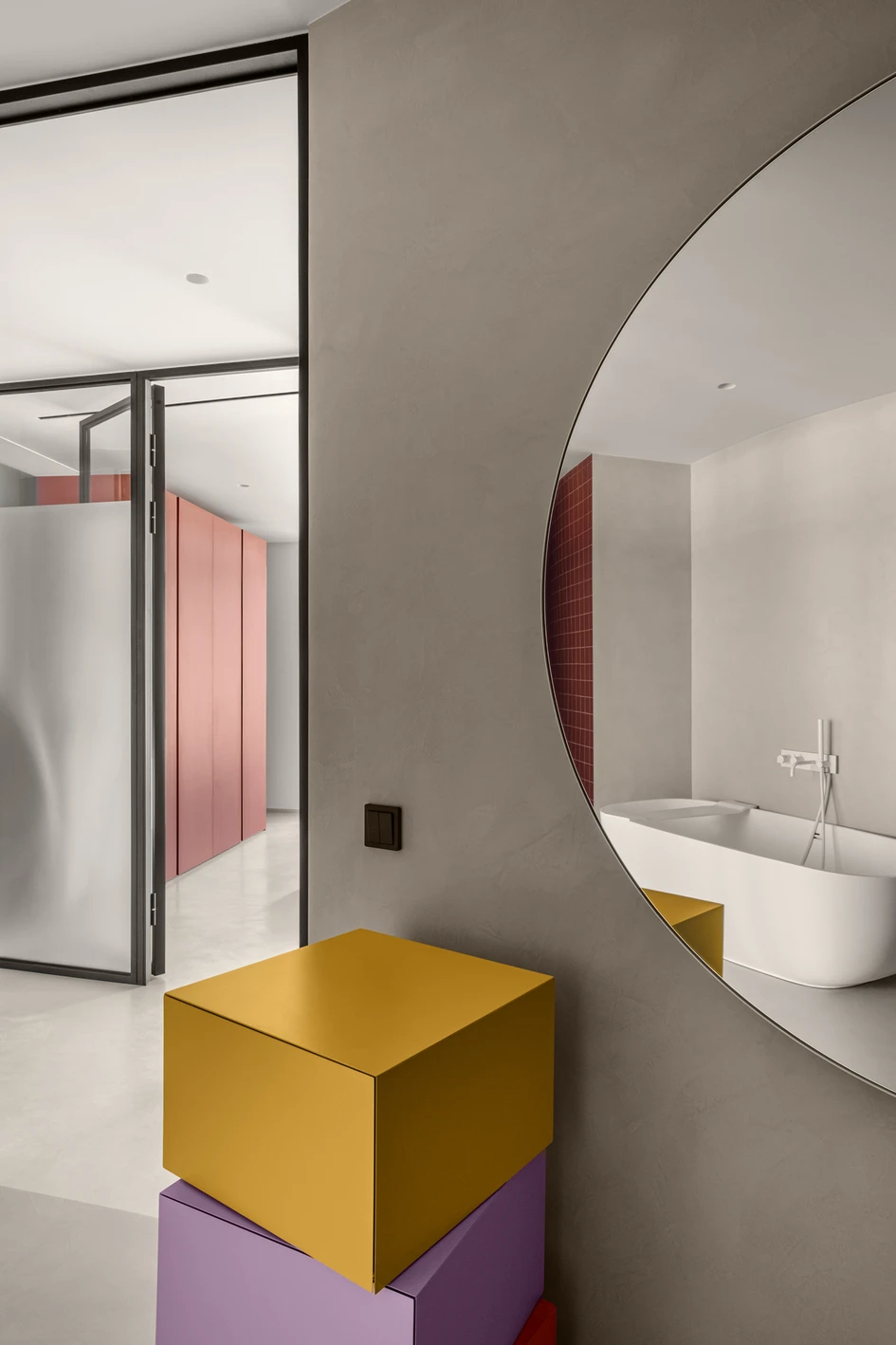 The layout of the apartment is part of a circle divided into sections. We combined several sections into a living-dining room-kitchen-hallway. In the next room there is a bedroom, in which there are two entrances: from the main corridor and the dining area. Another section was used for the dressing room with a make-up area by the window, two terracotta wardrobes, an island chest of drawers and a case made according to our sketches. Part of the walls were replaced with glass partitions with integrated doors to increase the illumination of dark areas. That’s gives an opportunity for daylight to reach the most remote corners of the apartment. The master's bathroom also was placed behind such a partition.