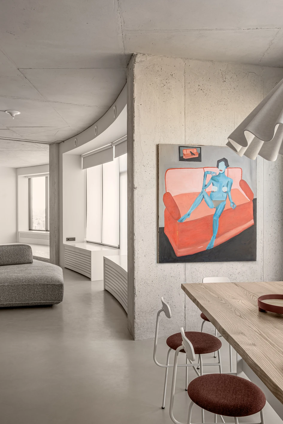 The decoration concept is to preserve the exposed concrete of columns and ceiling, which we covered with translucent varnish. With them visually corresponds microcement floor. We wanted to avoid boiling white colour. Therefore, the walls have a warm beige hue. Terracotta kitchen, sky blue dining table and green bedside table set color accents in space. The space turned out to be quite cozy, despite the strict forms and a minimum of furnishings.