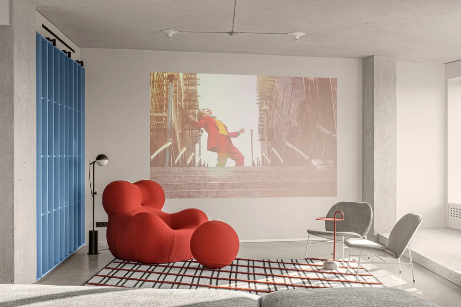 Based on the principles of minimalism, we deliberately hid all nonessentials. For example, storage panels and an electric panel were hidden behind the panels at the entrance to the apartment. We organized several hidden areas to relieve the main space from upboards and household items not of prime necessity. We organized additional dressing rooms, a laundry room and a guest bathroom. Even the TVs were refused. Instead, projectors are used in the apartment, and the walls of the bedroom and living room serve as screens for projecting images and videos.