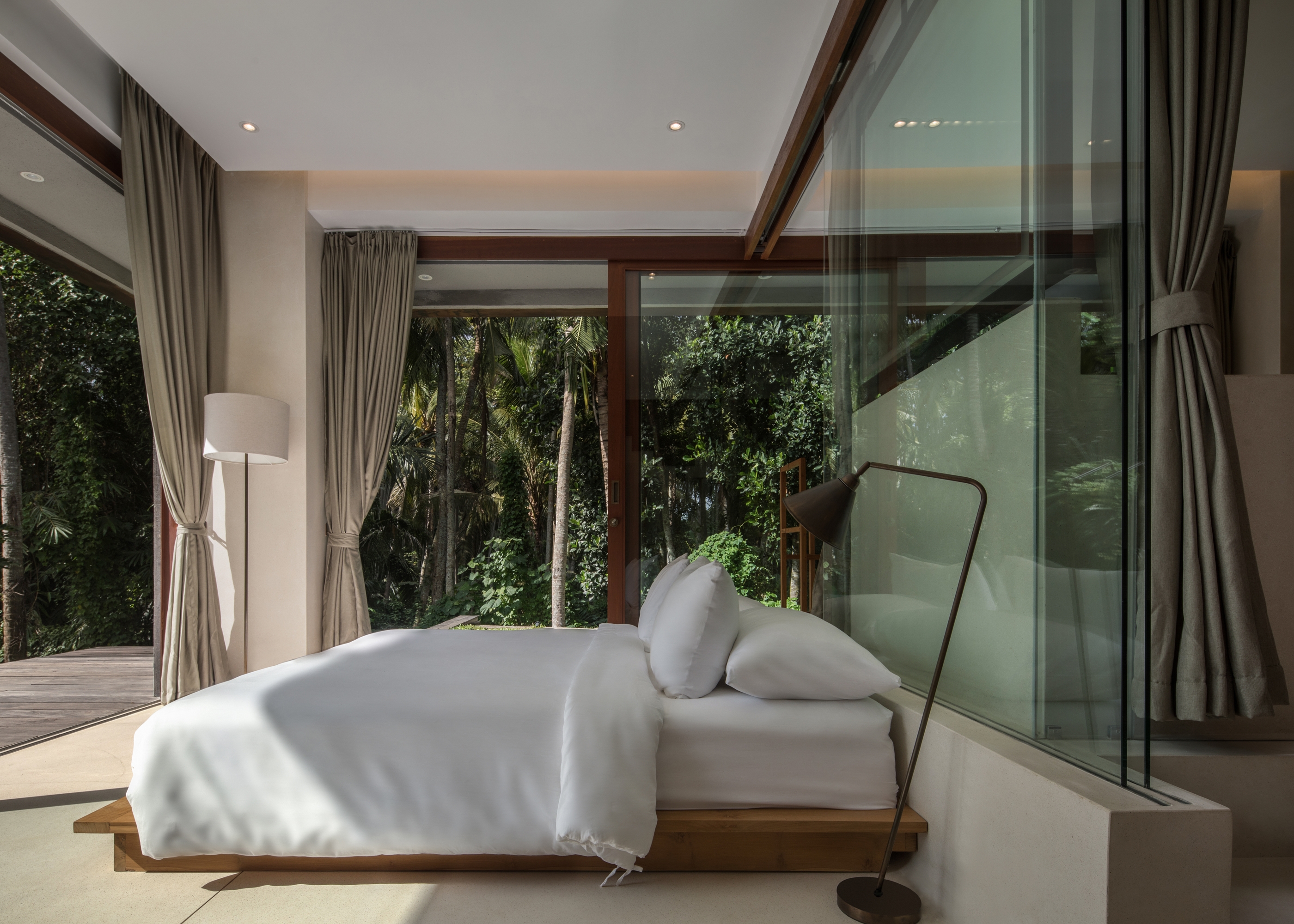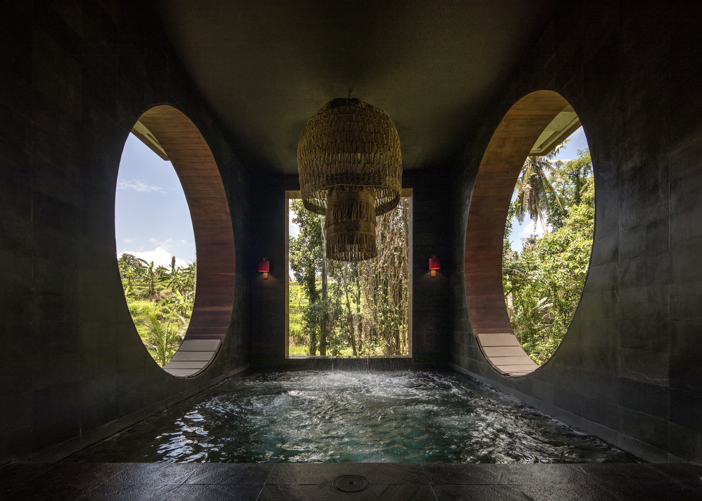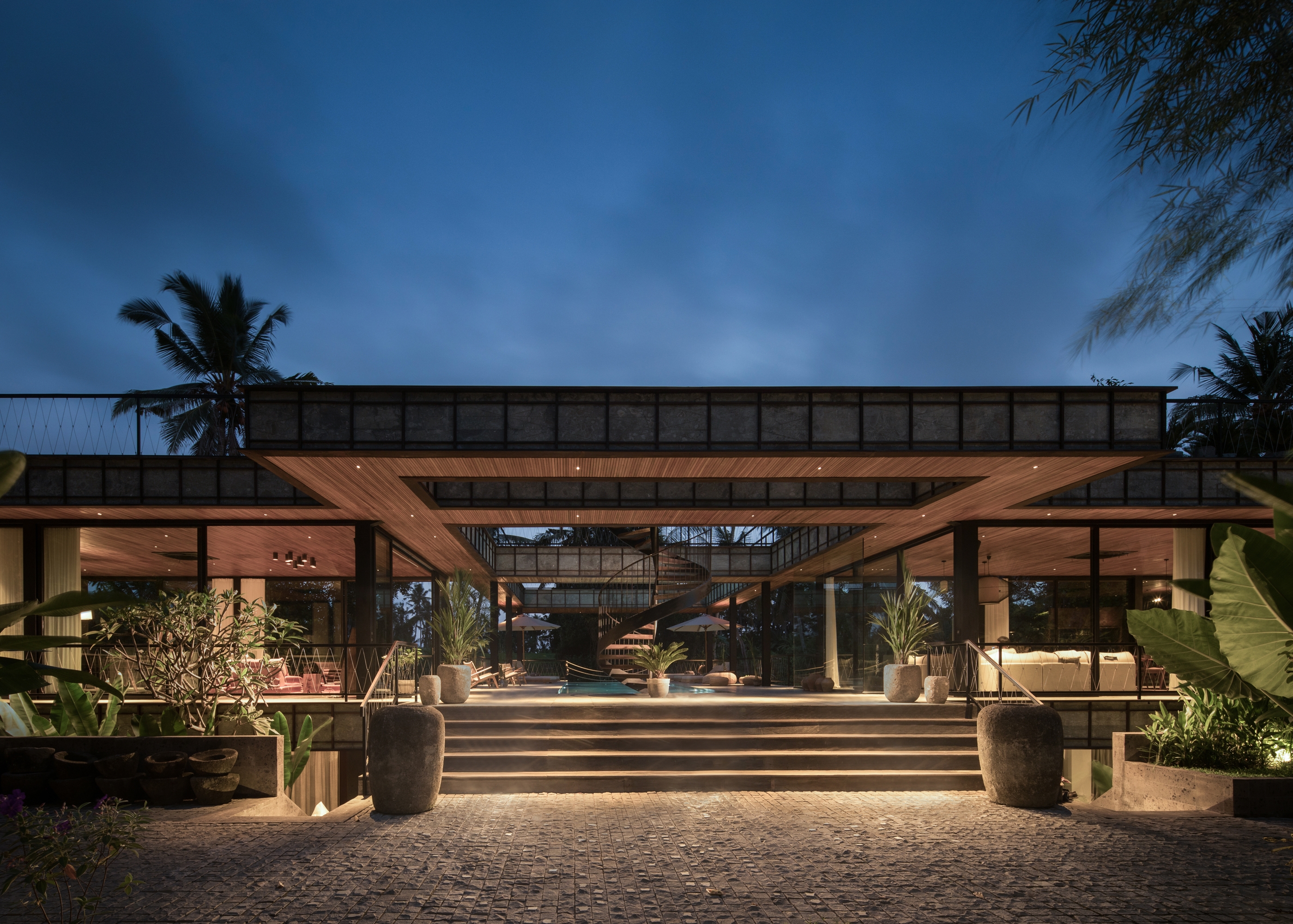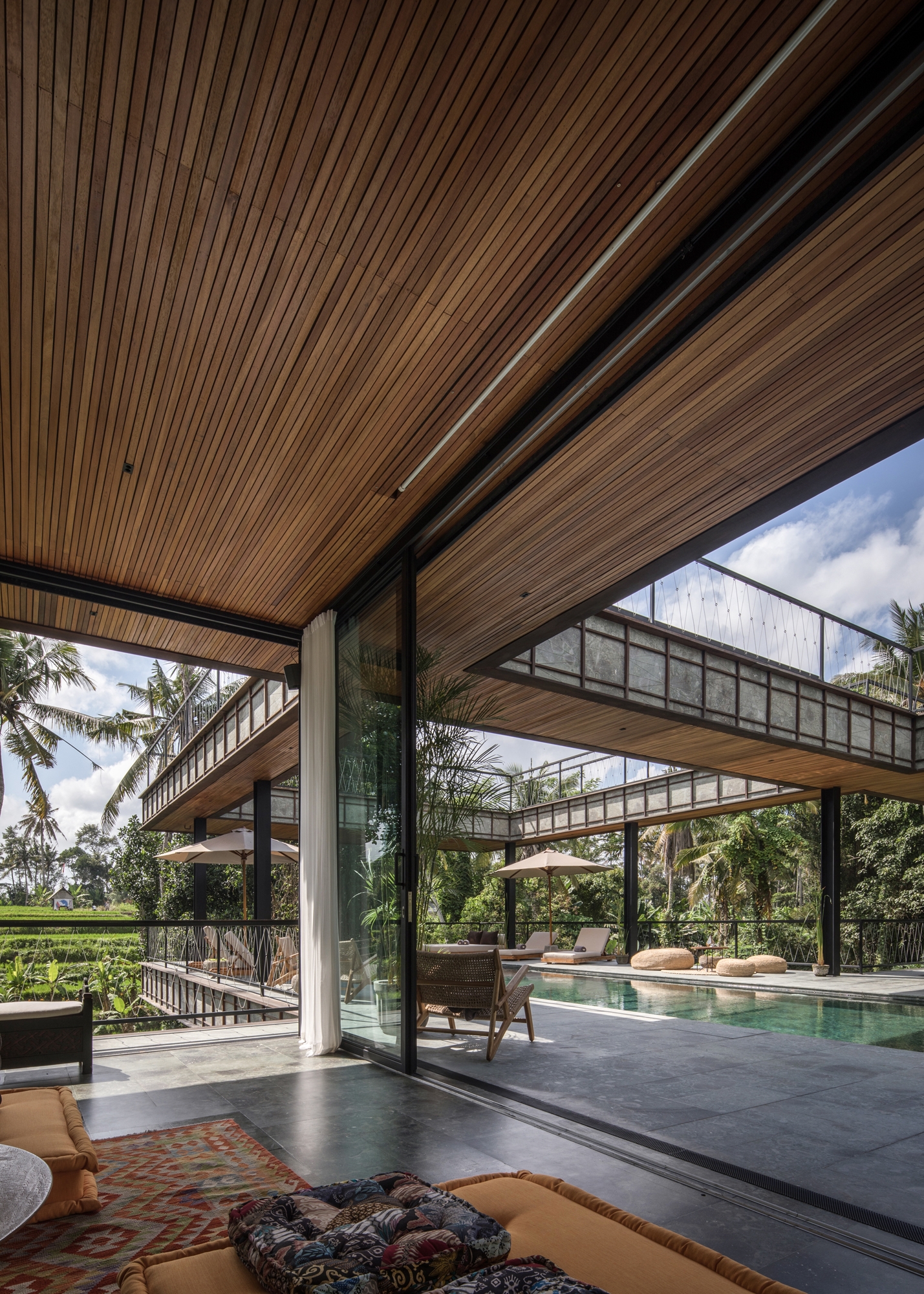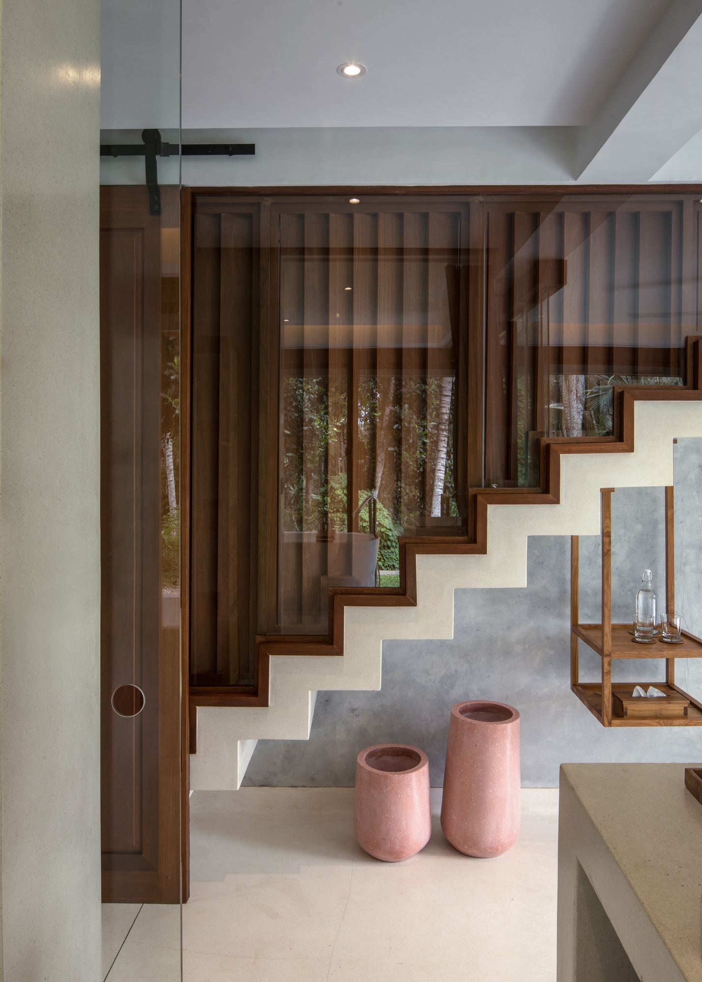 Chosen materials amplify the seamless continuation of the outside and sukabumi stone is the conceptual fossilization of the jungle, defining all hard surfaces. The wooden ceiling adds warmth and marks all ‘inside’ spaces to be specific.