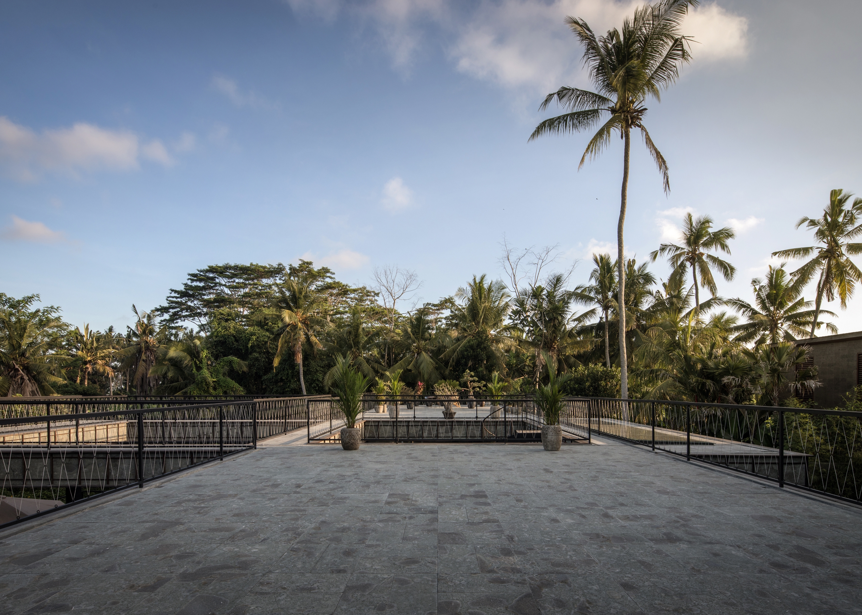 The spiral staircase is the central sculpture and connects to the vast roof terrace, from which one can enjoy views onto rice fields as well as back down into the pool area.