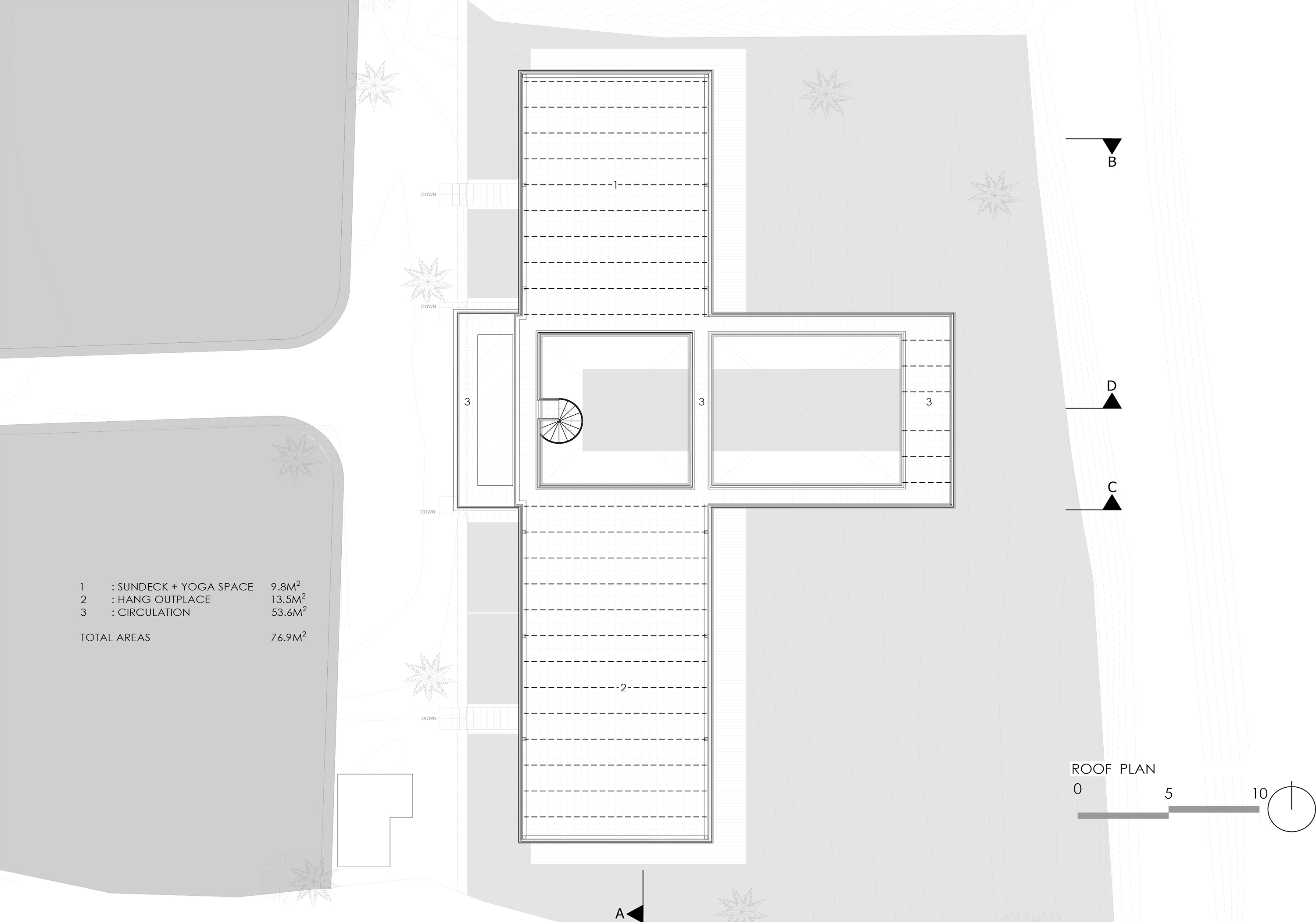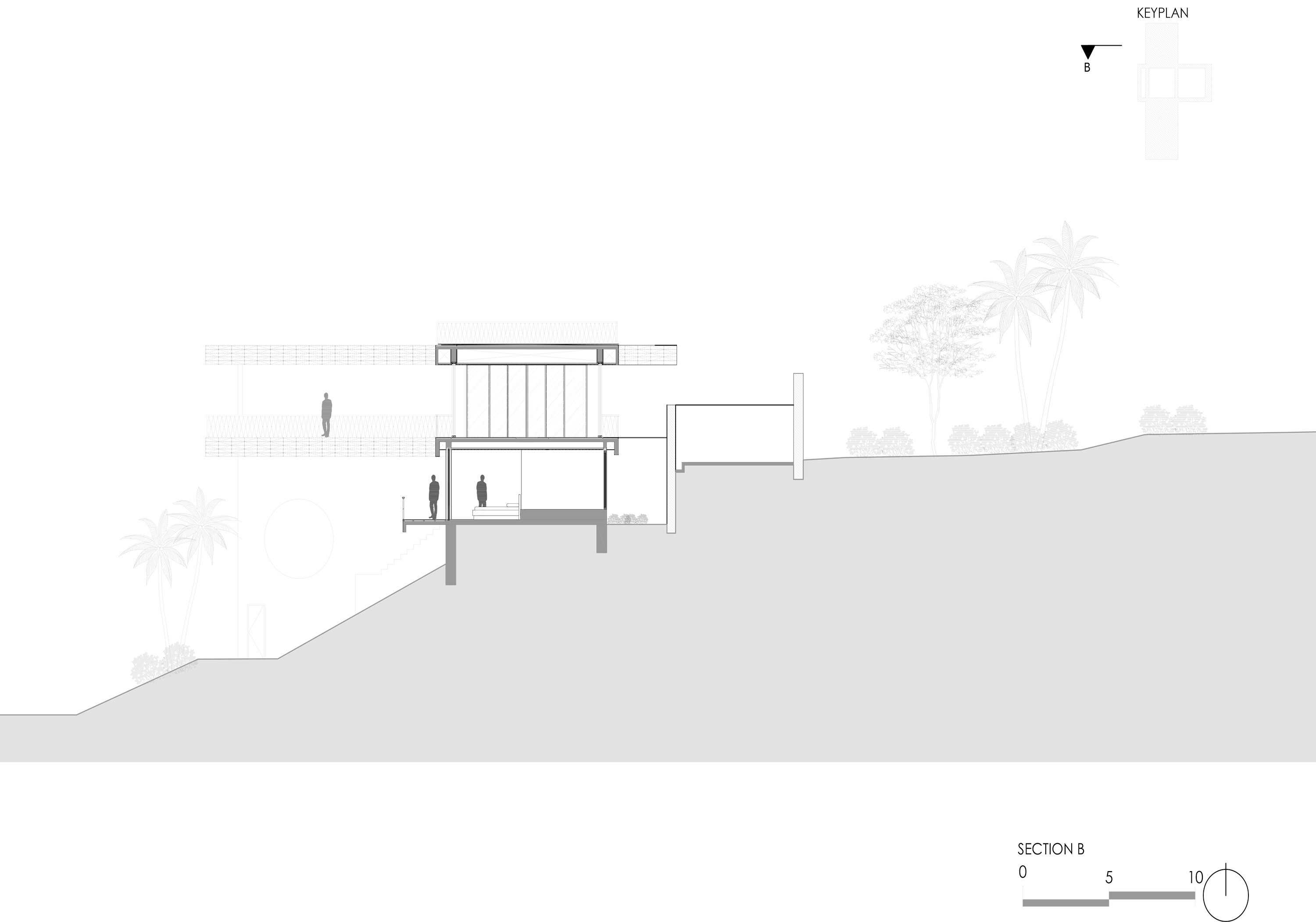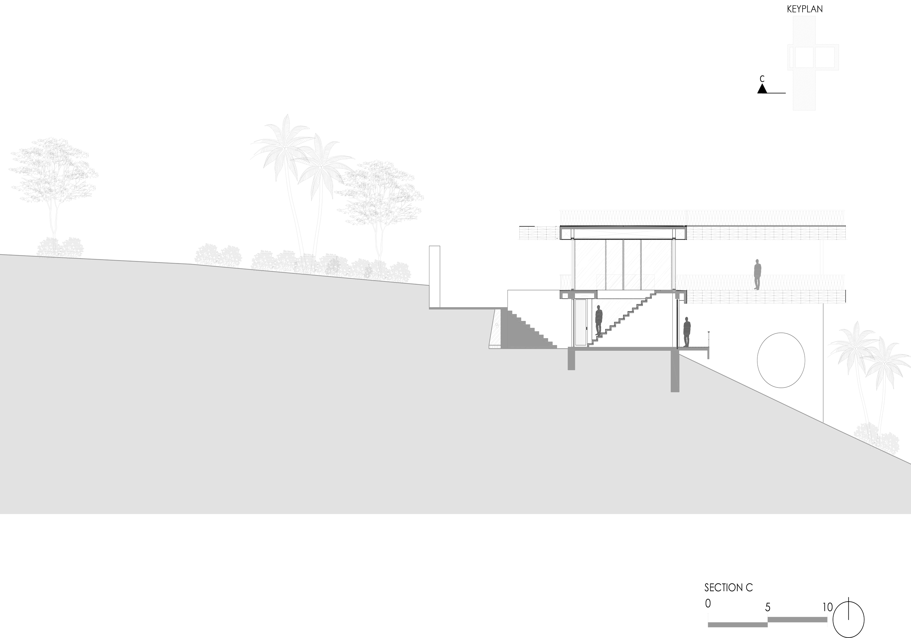 The slab is seemingly hovering about these spaces and has large openings above the pool area that provide views from the roof terrace back onto the pool.