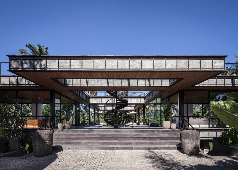 The spiral staircase is the central sculpture and connects to the vast roof terrace, from which one can enjoy views onto rice fields as well as back down into the pool area.