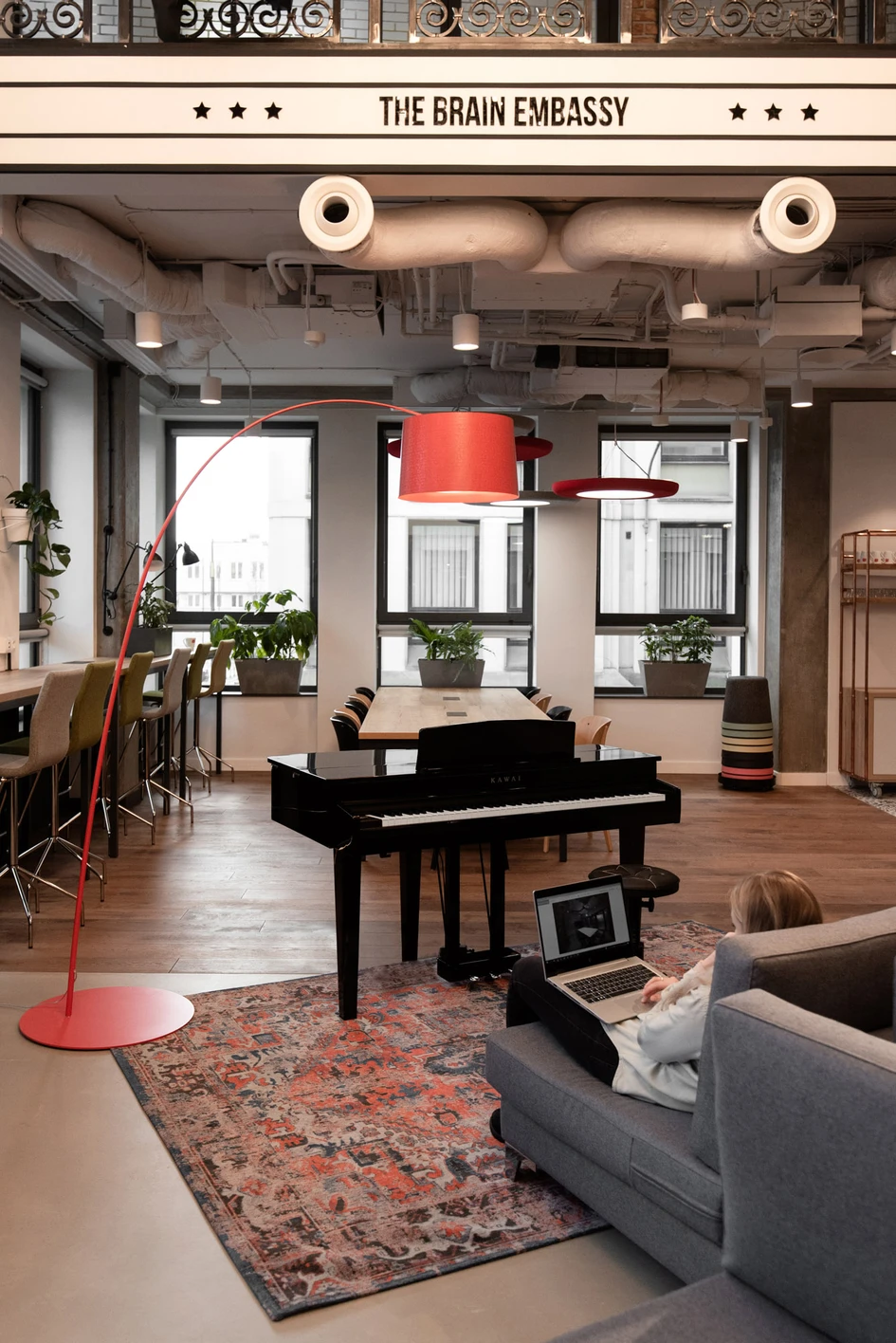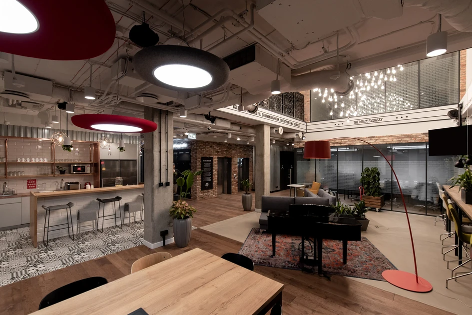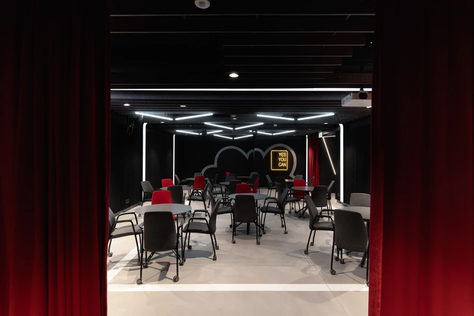 Majestic building being the example of Warsaw’s socmodernism, apart from serving as an office space inside of its walls, it hosted a cult like Teatr Kwadrat. Designers did not indifferently skip this fact and merged DNA Brain Embassy with a broad spectrum of theatrical inspirations and various forms of creative activity.