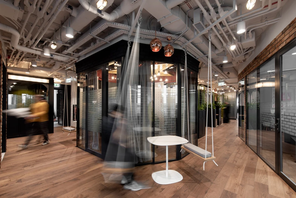 Visitors are welcomed with the view of elevators, over which bulbs and signs are hung in the style of Broadway theaters’ entrances. Another space that’s startling from the get go is a high patio with a chandelier that goes through two storeys. Completing the vibe of the main motive are conference rooms, which emancipated the theme of multiple artistic activities connected to theatrical arts.