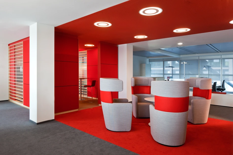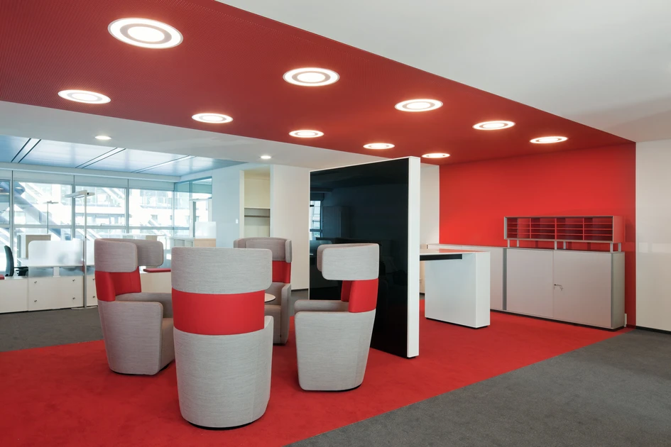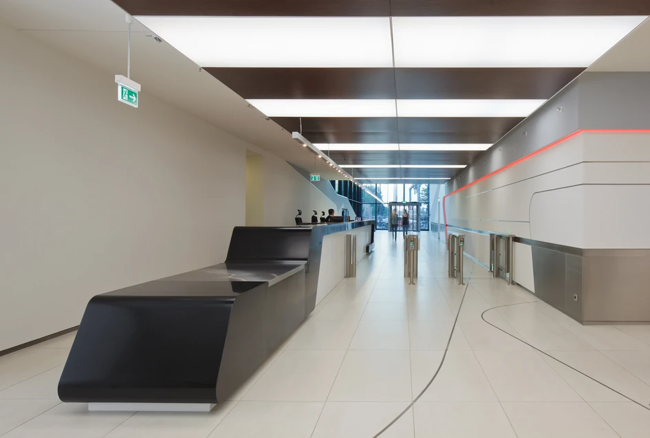 In den Foyers und vor den Aufzügen galt es eine gefällige Lichtstimmung zu schaffen, um einer gedrungenen Atmosphäre entgegen zu wirken. Gelungen ist dies mit den Lichtdeckensystemen Plenar von TRILUX. In den flachen Deckenbereichen sorgen sie für eine tageslichtähnliche und vor allem großzügige Raumwirkung.