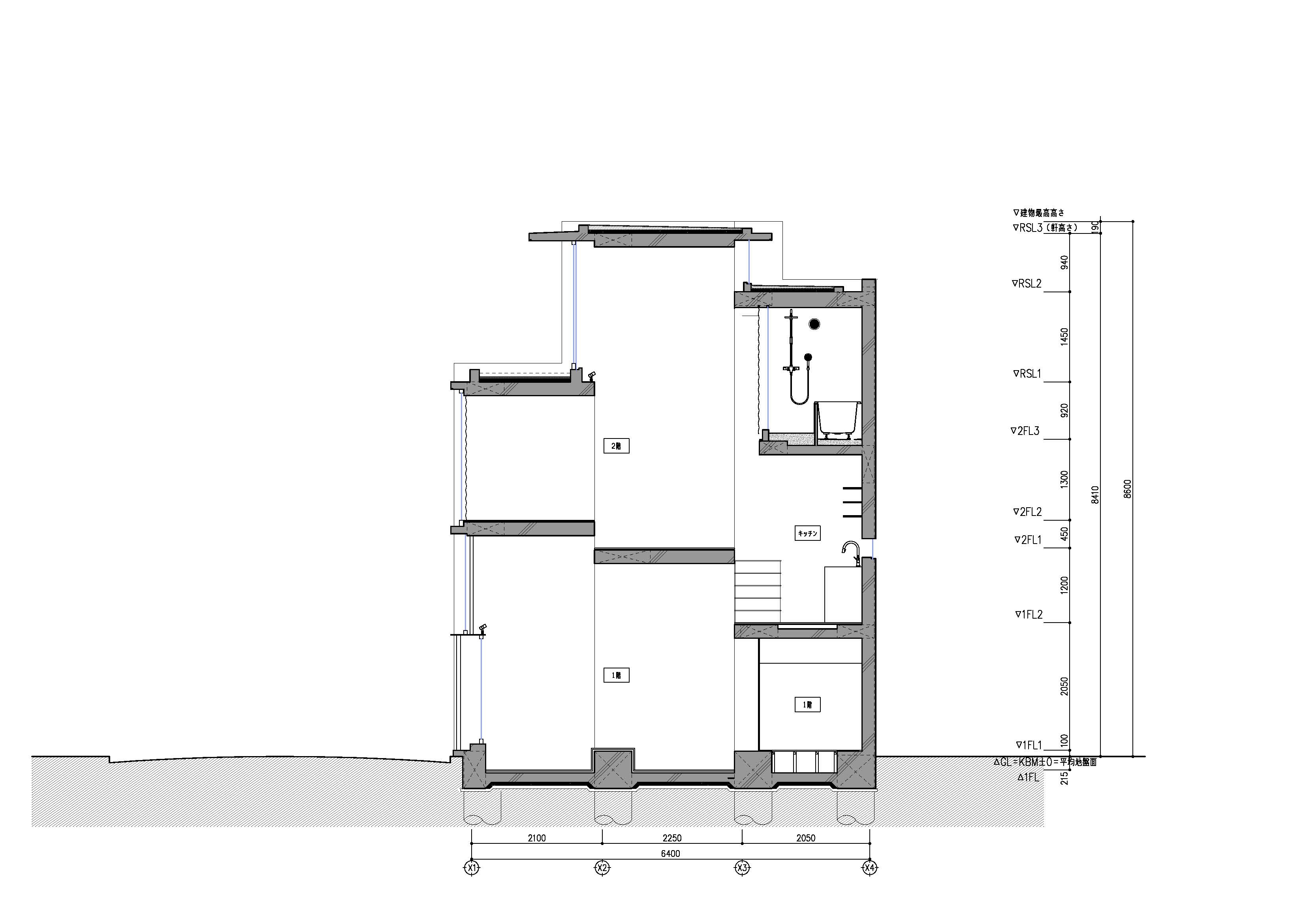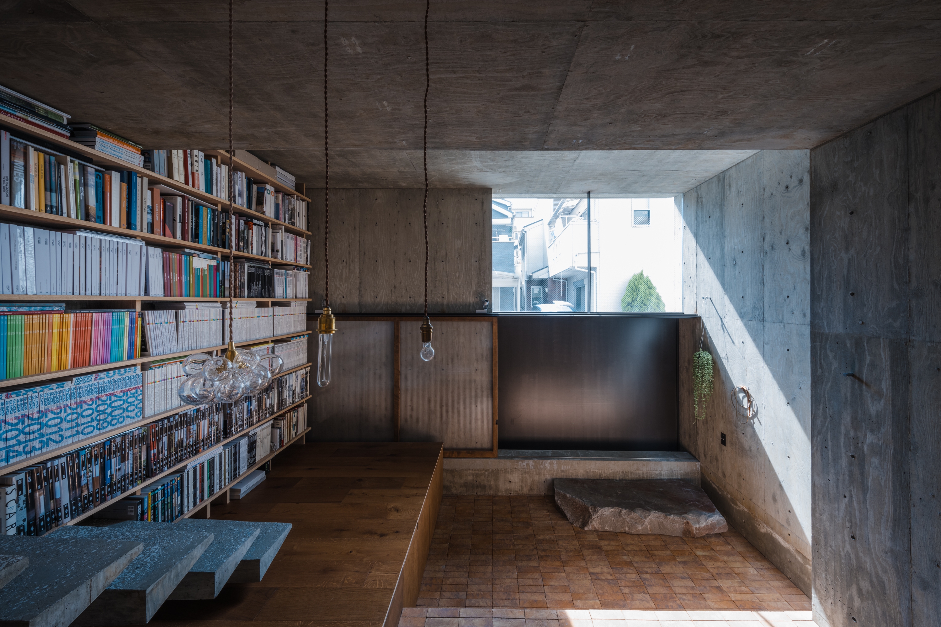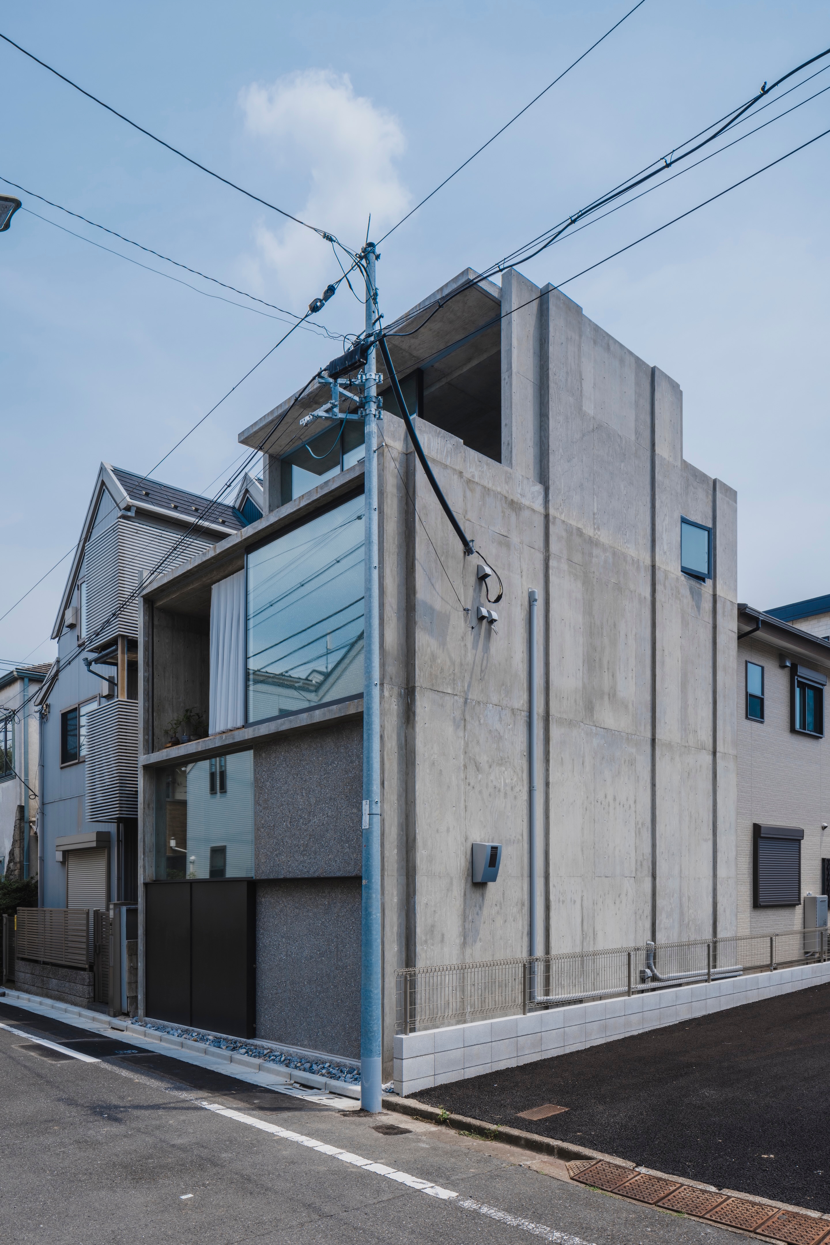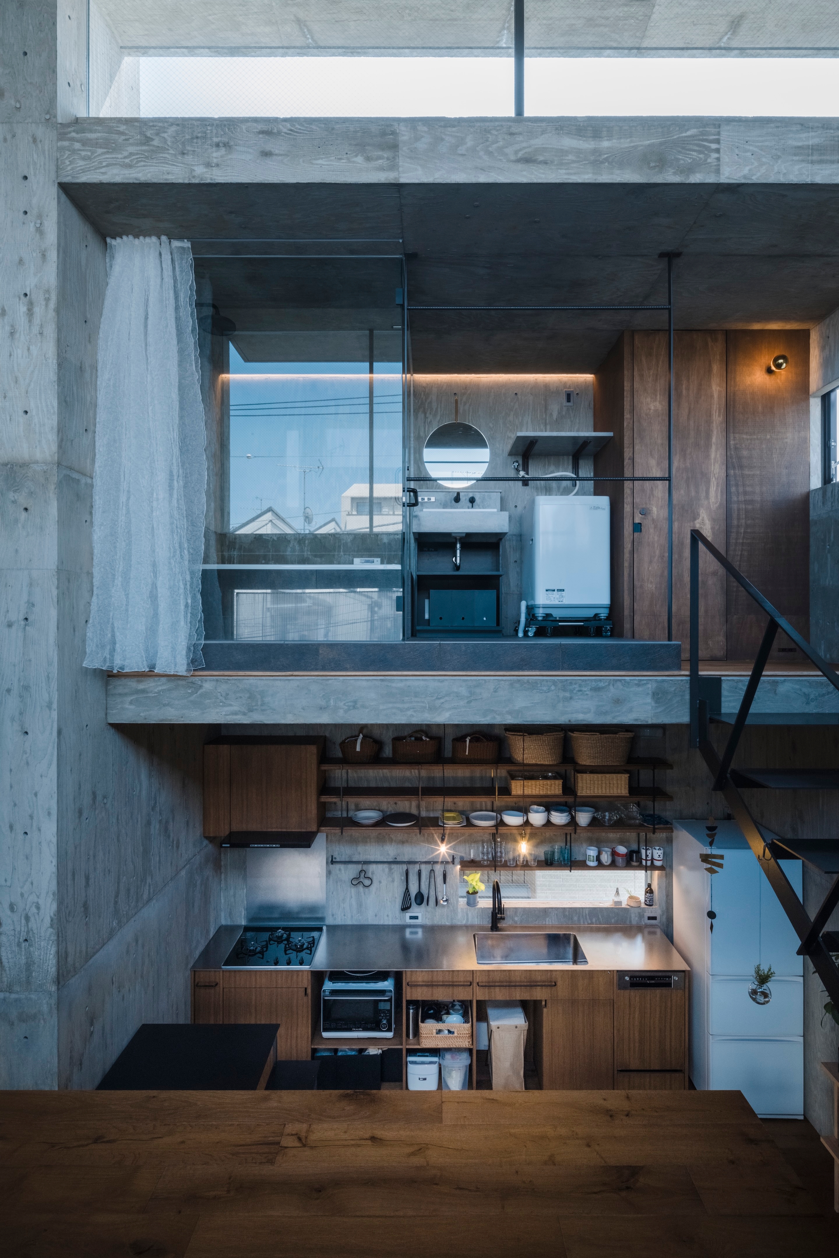 The north side wall in the building has skewed to create a space that connects to the adjacent vacant site. Along that wall, the heights and depth of each floor had adjusted throughout the building. These misaligned three walls and 7-floor slabs with different heights and depths overlap each other without breaking up their top and bottom ends. This structure creates openings that bring in natural light and breeze, but by avoiding views into other houses. There is no opening to the south side; thus, strong sunlight does not penetrate inside.