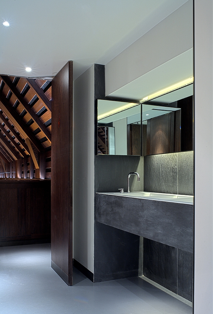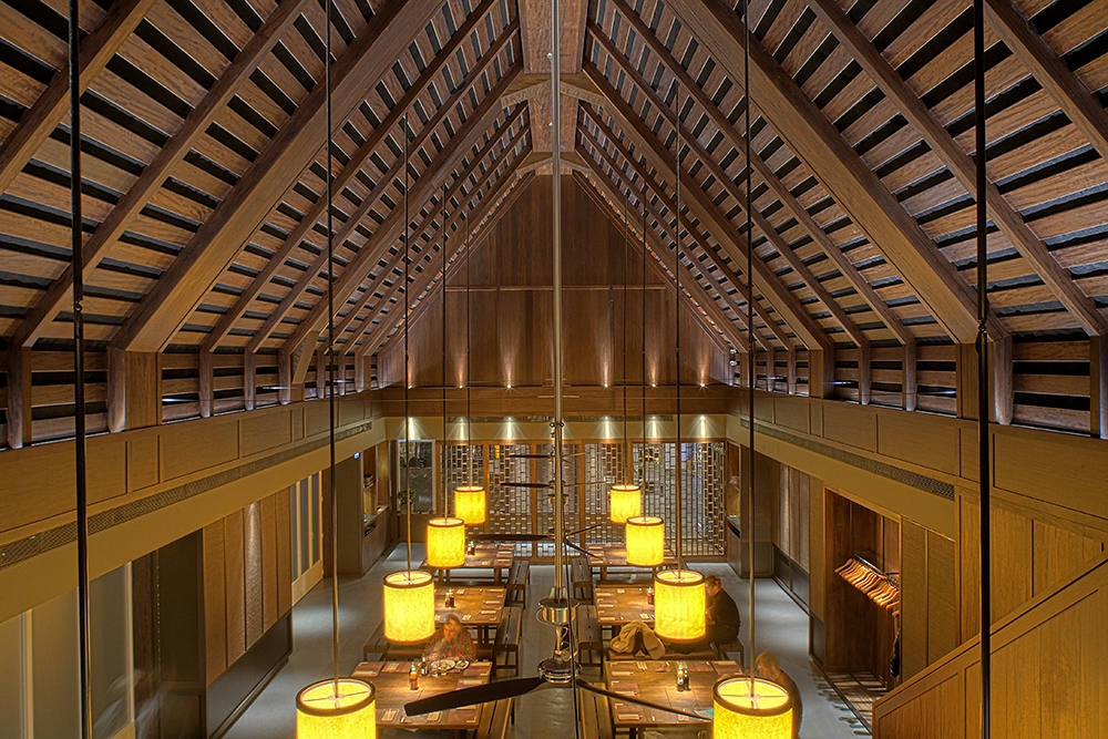 The approach to detailing retains aspects from traditional Thai houses . Walls are lined in dark stained rattan , The roof is detailed with 600mm deep down stand beams with hard wood purlins and boarding and the furniture is detailed in teak and pegged together. The bars and bathrooms are detailed in black slate and the use of dark colours creates a welcoming atmosphere. Other characterful details include the ceiling hung lanterns and fans and Thai lattice screens forming the waiting area.