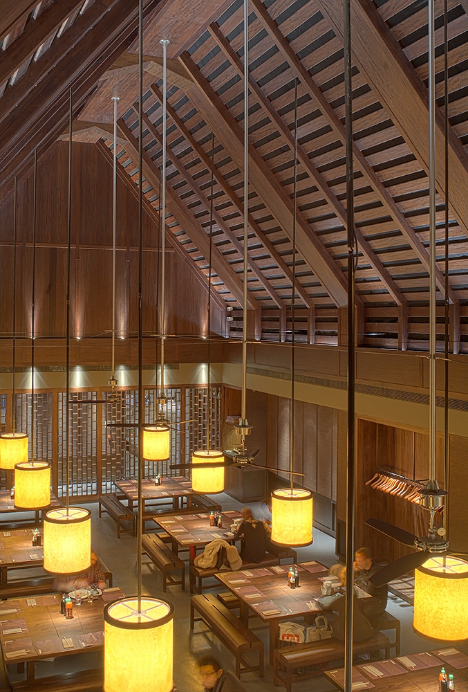 Busaba is located in Bicester Retail Village. The brief was unusual introducing a highly individual small branded restaurant into an a concentrated retail environment outside London. These circumstances provided exceptional opportunities. The single volume unit offered 9m a ceiling height. This was divided to include a mezzanine level which housed bathrooms overlooking the main dining hall from an open balcony. The lower level provided space for an open kitchen and bar area directly addressing the main dining space.