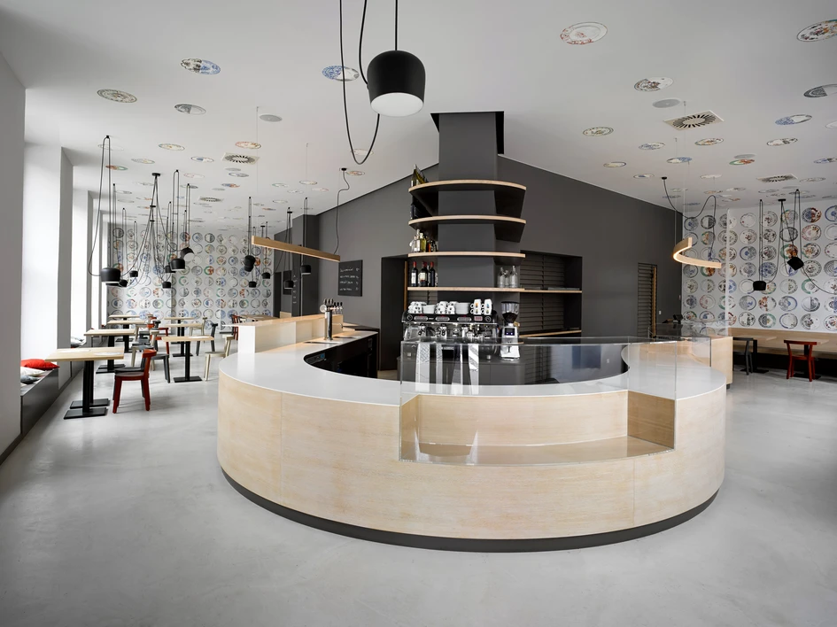 The interior makes use of a wide palette of monochromatic Grey-White tones which, apart from the wooden counter mentioned above, enliven the made-to-measure patter on the ceiling as well as the end-walls of both parts. The interior is also decorated with unequally situate lighting and TON Trademark Punton Chairs. These – together with tables are located in the Coffee Shop and Bakery interiors up against the windows and the opposite walls.