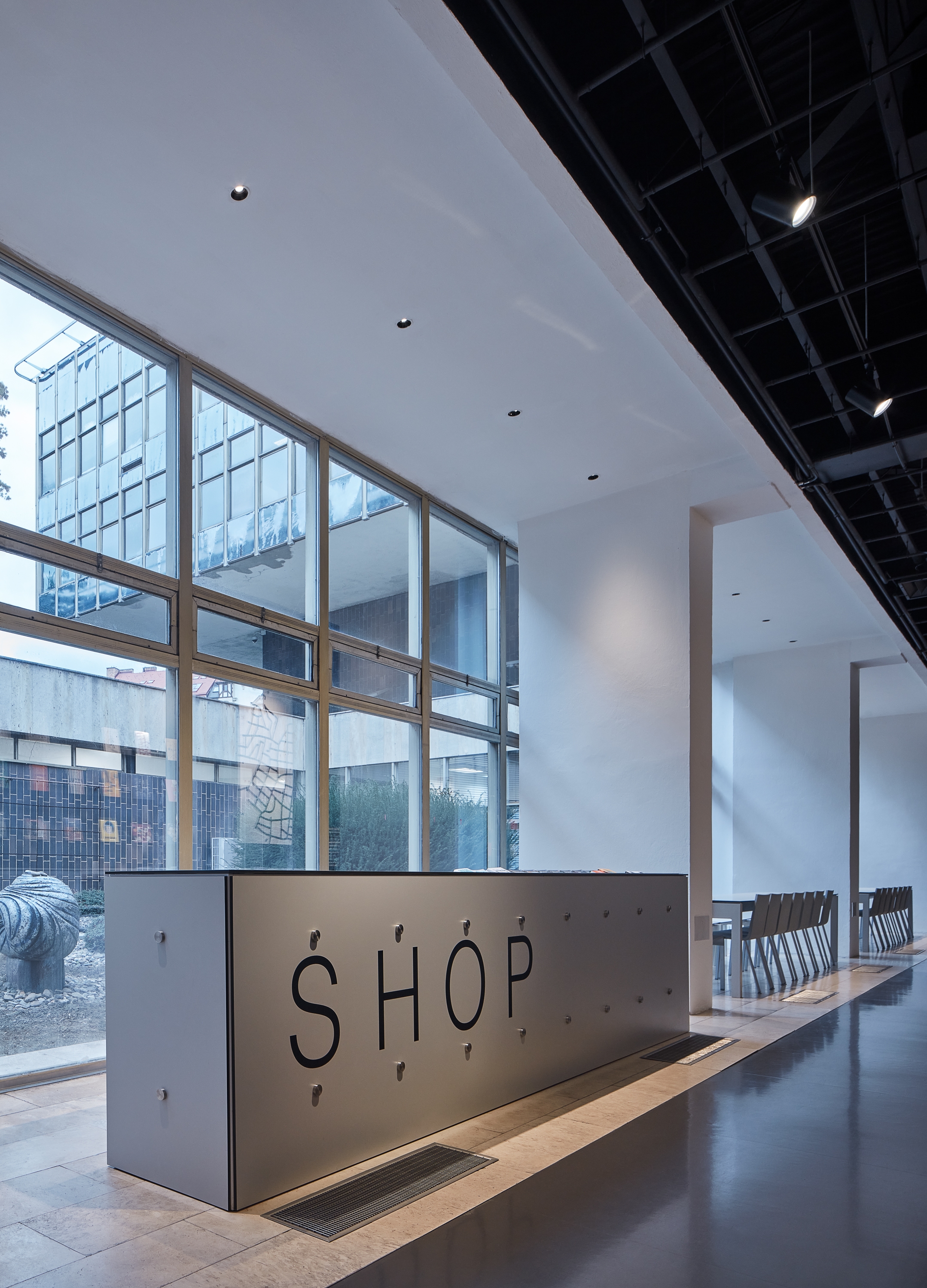 The larger “black” hall with the capacity of up to 250 visitors, completely blocked of daylight, is dominated by a panorama projection surface of 24×4 meters with an 8K resolution. This projection surface offers new possibilities in terms of working with images and, aside from audiovisual tracks accompanying expositions and lectures, provides also, for example, a 1:1 scale simulation of an urban city space. Annexed to this hall is a small arena used for discussions, smaller lectures or a movie theater. The library, along with the study hall and bookstore, is on the back side of the projection wall. It gets plenty of sunlight from the generous glass atrium that lies in the center of Prager’s blocks.