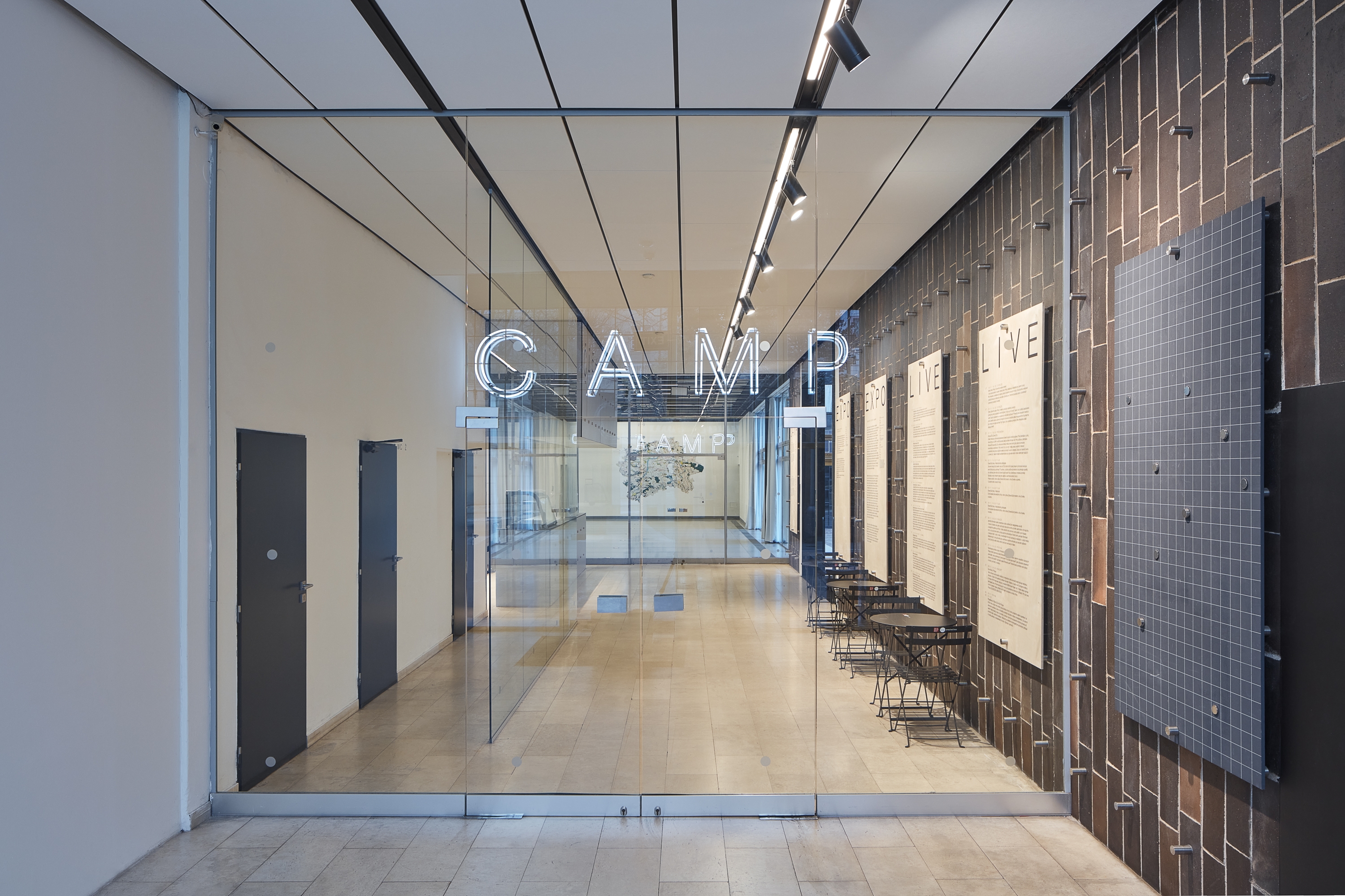 The interior of CAMP was created in a close collaboration with the authors of its visual identity and therefore can be considered its primary and key application. This concept is based on points in a square grid whose base subject is the work with scaling and density. The fundamental application of this grid in the interior is derived from the format of the original ceramic tiles, a dominant and authentic element of Prager’s architecture. Node points in the grid are materialized by atypical stainless steel screws and nuts creating shiny cylindrical joints. These serve as an anchor system for exposition panels, furniture joints or as space navigation.