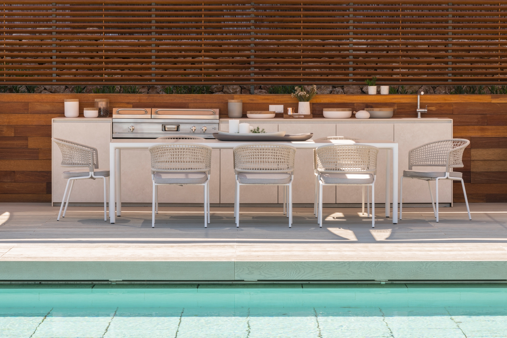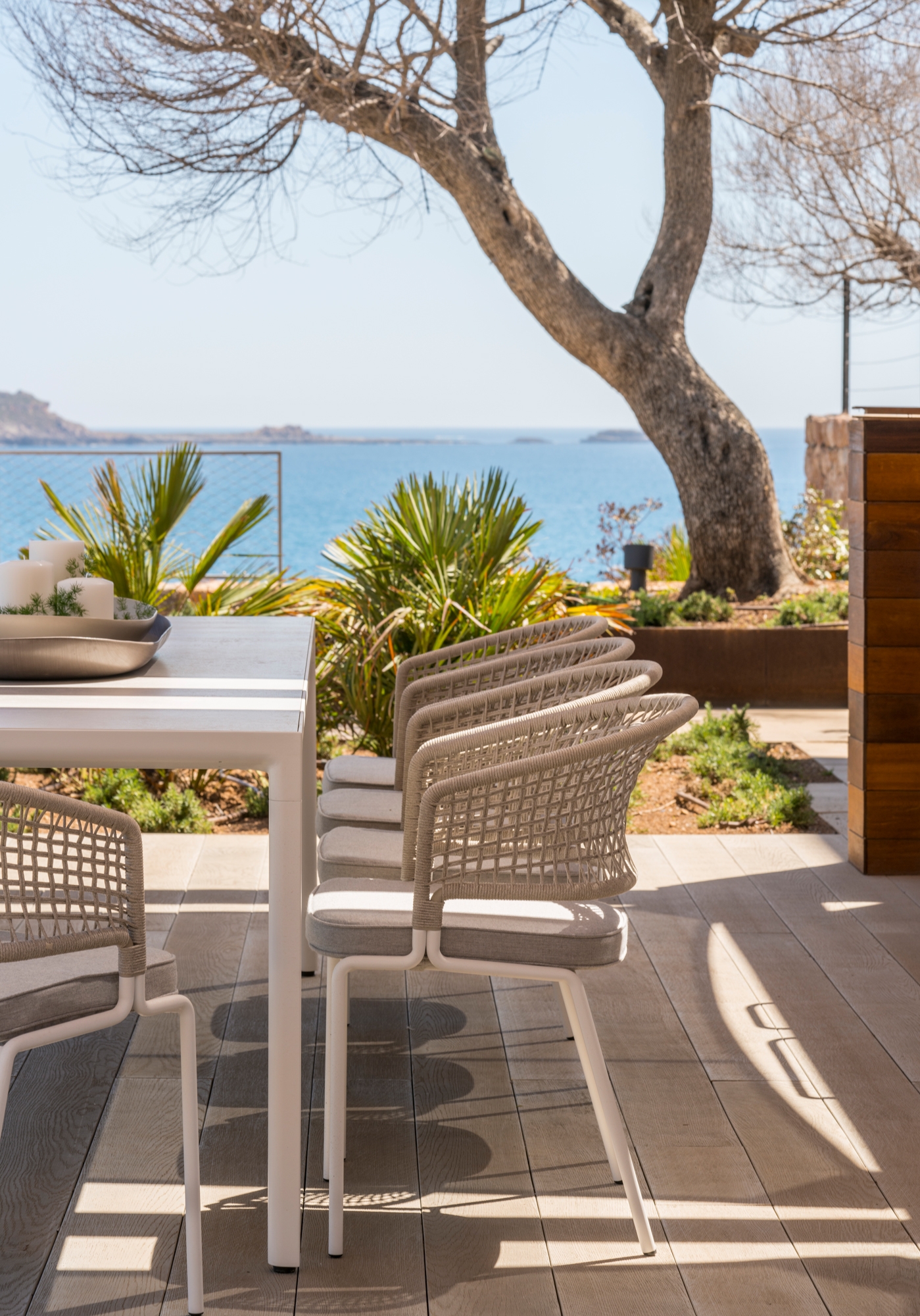 The interior designers of Terraza Balear kept the outdoor spaces simple and chic, focusing on Tribù's Pavilion Daybed by Monica Armani on the pool terrace. “We didn’t want to interrupt the views. This Tribù piece doesn’t pull your attention away, but still has the luxury quality we were looking for.” In keeping with the pale stone used for the villa, Terraza Balear chose Tribù’s CTR Armchairs. The cool, curved, linen-weave backrests also reference the shapes and tones of the landscape setting. CTR club chairs teamed with Drops side tables continue the theme of elegant outdoor living. Because of the colours, fabrics and materials, these pieces can be integrated perfectly with the architecture of the house. One of the pleasures of a Mediterranean climate is eating al fresco. Tribù’s CTR Armchairs and slimline Illum table provide a seamless transition from the interior styling. A Natal Alu Sofa, as deep-cushioned as it is stylish, with a strongly architectural powder-coated frame, is the perfect spot in which to relax, take in the view and dream away an afternoon.