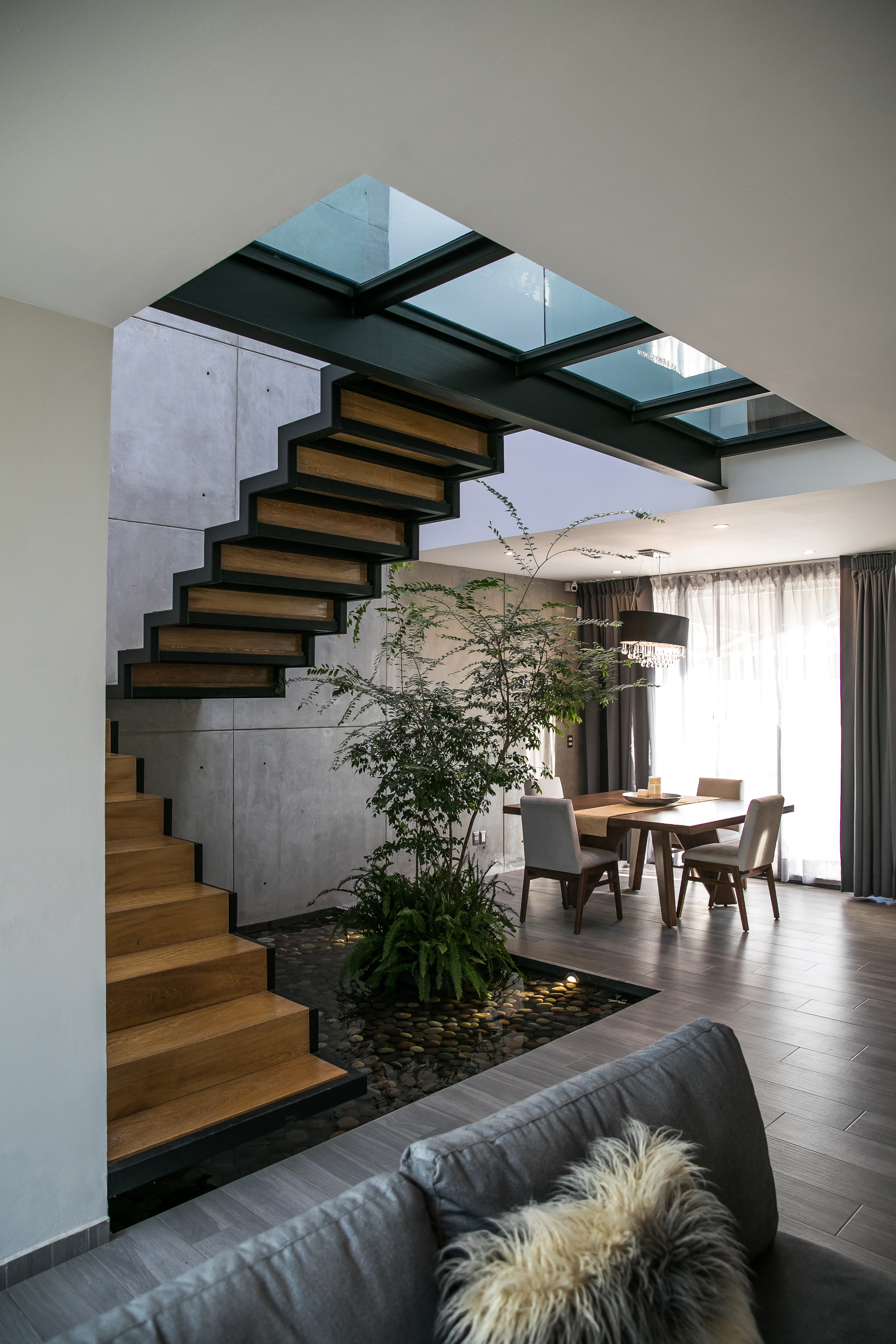 Once inside, we can perceive that most of the walls are mortar plating in white colors, with a view towards the central water mirror and the terrace at the back. The floors throughout the ground floor are made of porcelain tiles in gray tones. The main staircase is forged with ptr frame paper steps, covered with parota wood. All interior carpentry (doors, steps, bathroom furniture, closets, lattices, coatings), are made of wood of parota. The upper floor handles exactly the same tonality of finishes on its walls and floors as on the ground floor.