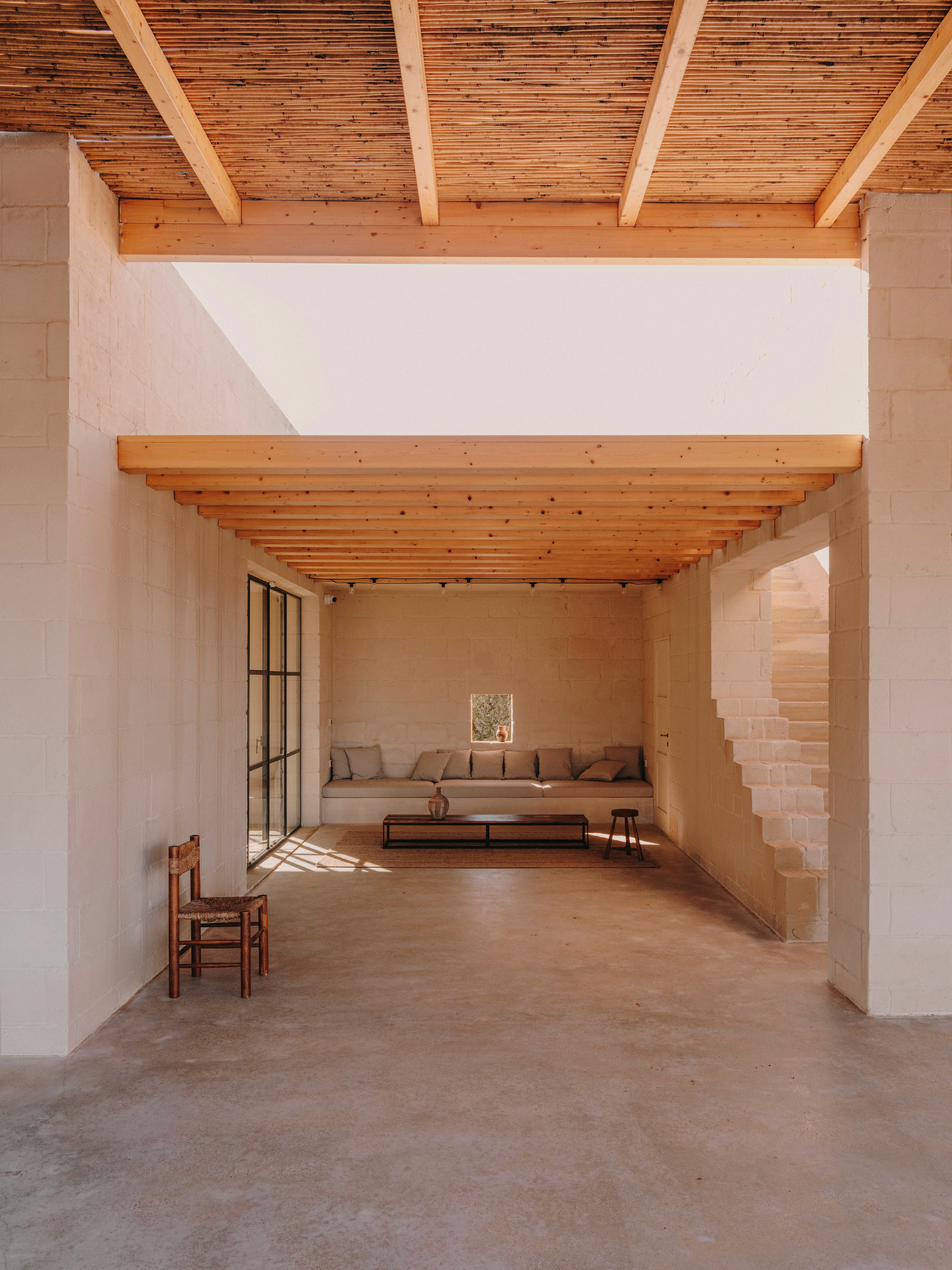 The house was placed at the most southern border to take advantage of the elevated level, and to achieve the best views possible of the sea, which is only a stone’s throw away. Positioned east-west, with views to the north and to the south, meaning the house is perfect for winter as much as in the summer. Being a house for the family, and to be rented, the outdoor summer living and the connection to the surrounding nature was high on the wish list of the client. The large veranda, covered in thick cane, reminiscent of the souks in Marrakech, giving ample shade for the midsummer sun, the perfect place to relax, eat lunch or take an afternoon siesta. As you enter the house, it feels like a villa set high above its walled terraces, proud on a hill. An architectural statement, with simplicity at its core.