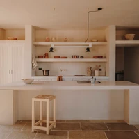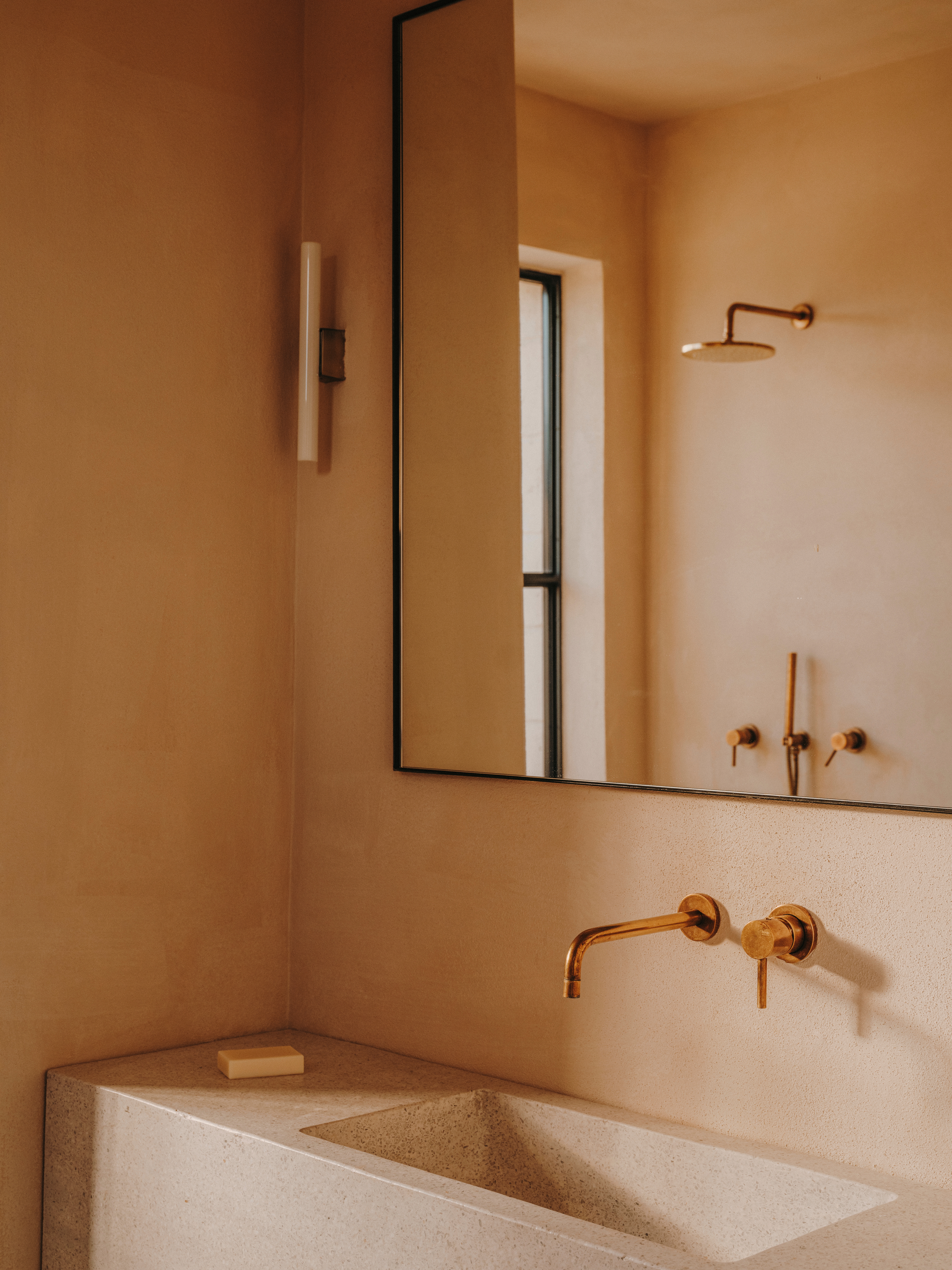 Areas and material description. The kitchen was designed with several niches to be used as storage, and a large island, for which it was designed a bespoke terrazzo top created by a local artisan. The bathrooms were equipped with bespoke and locally made sinks designed by the Studio. To cover the wet areas, cocciopesto was used.