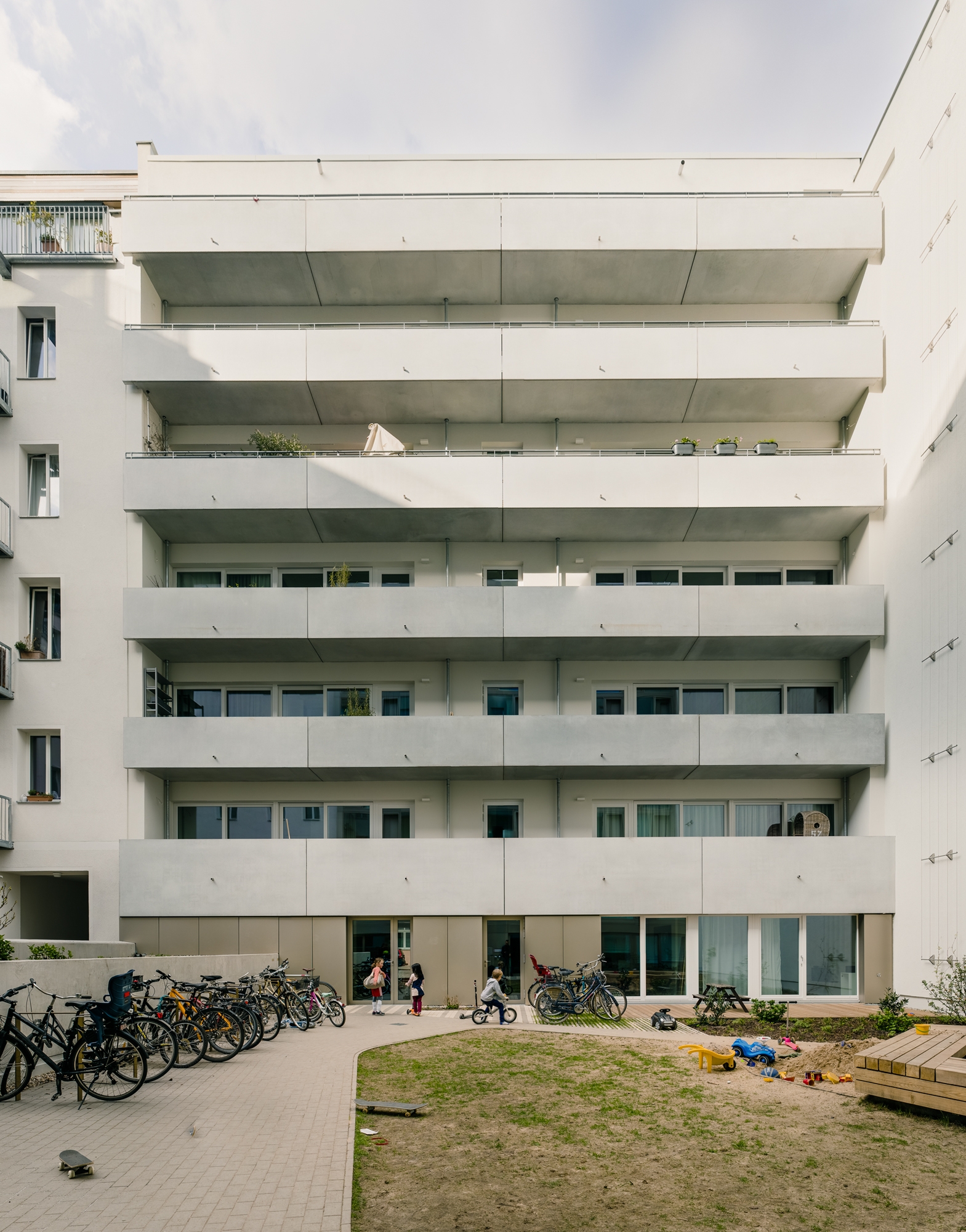 The different façade concepts and their contrasting usability meet in the courtyard. On one side, the continuous balconies with raw fair-faced concrete balustrades ensure privacy even as far as the exterior space. On the other, the perfectly smooth aluminium and glass façade allows residents to decide whether to present themselves or retreat behind curtains. The entrance area is recessed slightly, allowing the key zone of contact between public and private areas to be more permeable, weather-protected and paved with street slabs.