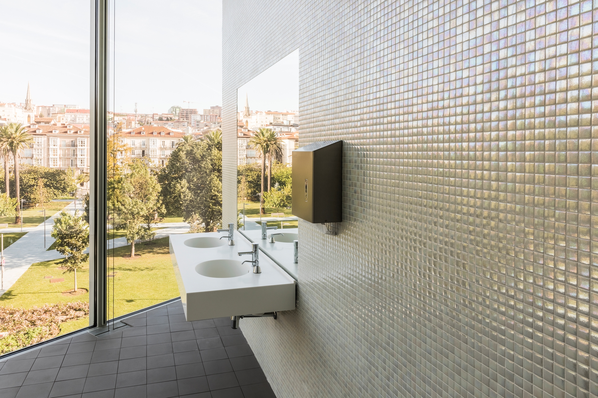 The walls are clad in soft and glossy mosaic tiles that seem to change colour depending on the light, adding a touch of distinction to the space.