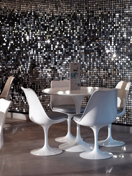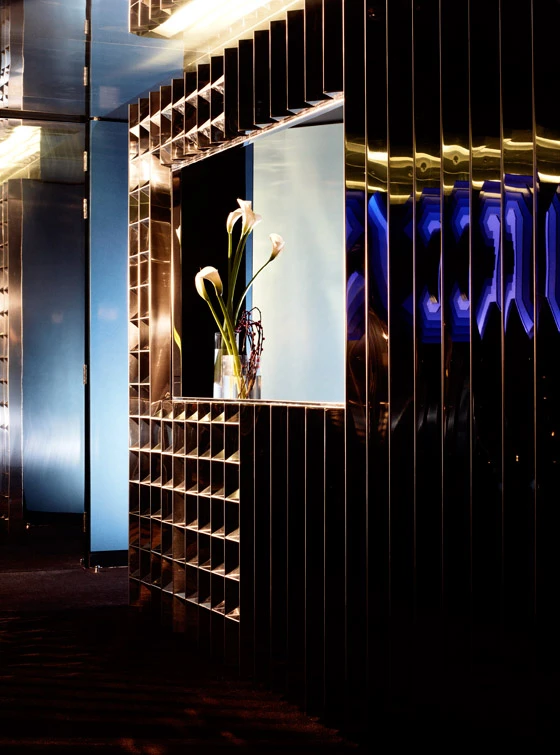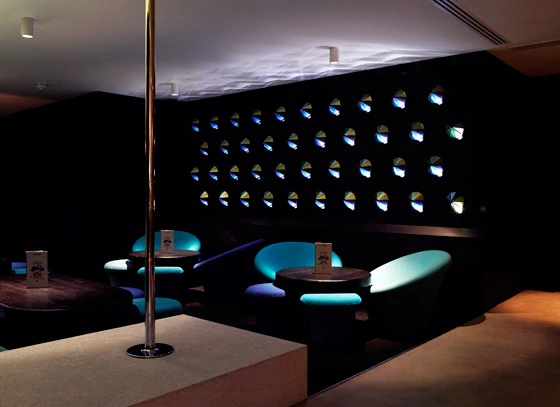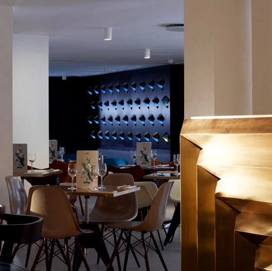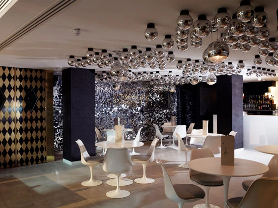 The surrealist inspired design incorporates a landscaped ceiling of mirrored globes, a kaleidoscopic reception desk and a kinetic, 3d art wall. The bespoke furniture engages and entertains: the main dining table doubles as a stage (which moves to allow for a larger dance floor), the step into the lounge integrates a dance pole, a mirrored WC lobby houses a hidden water-fountain and animal inspired furniture encourage participation and conversation.
