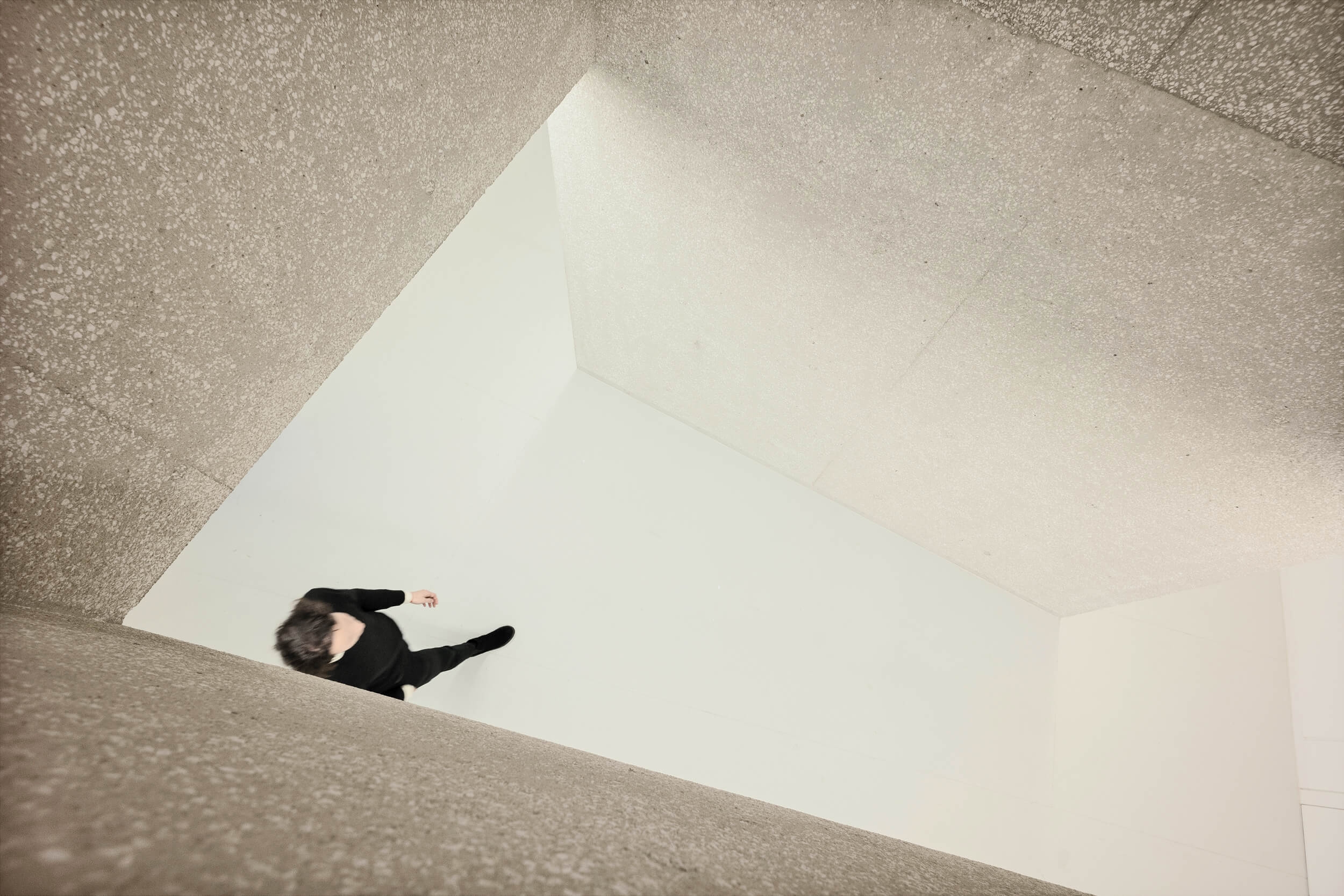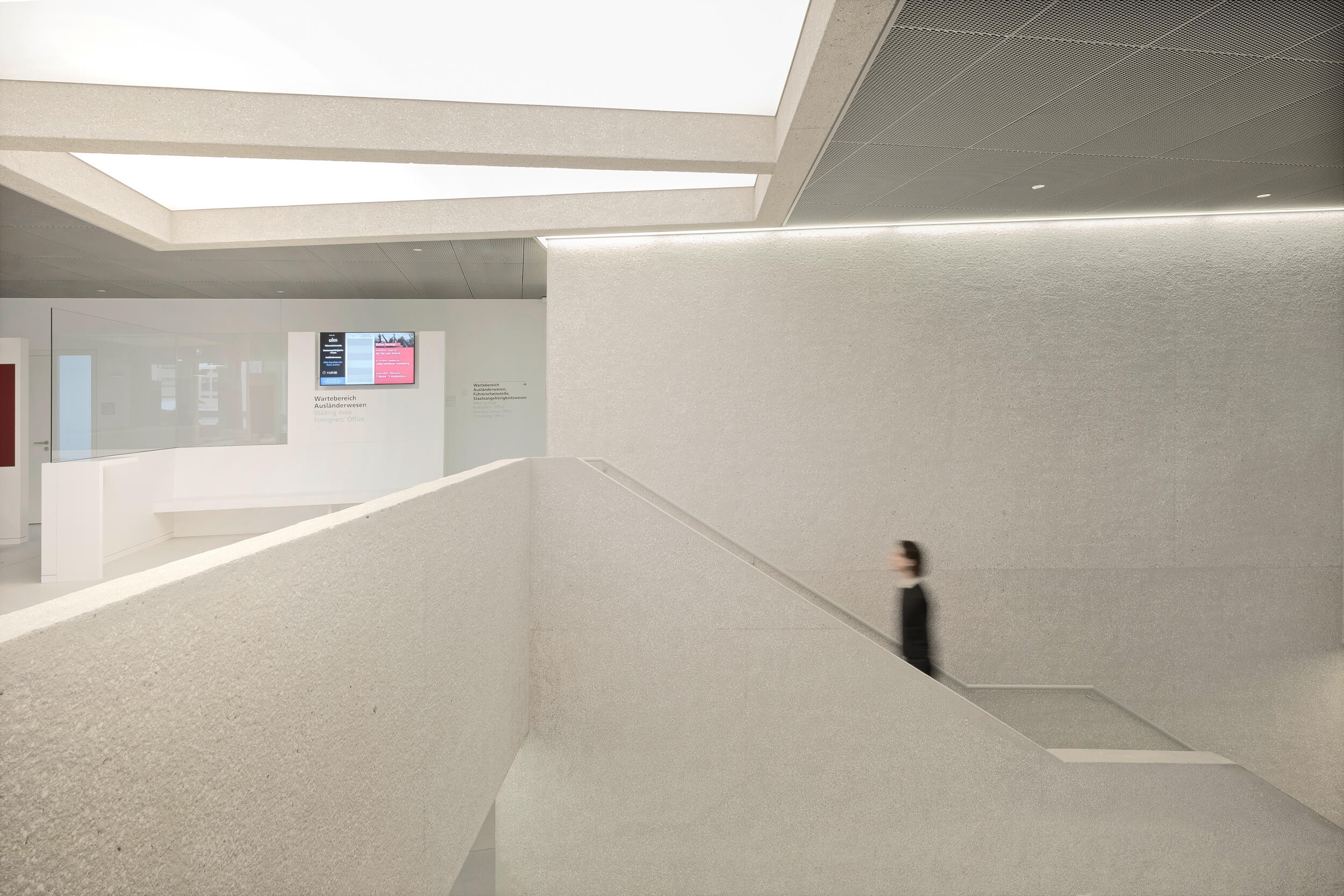 Together with the neighbouring Chamber of Crafts the new building is frames a small plaza and the public entrance. The visitor is welcomed by a two-storey hall, whose two levels are spatially linked by an open flight of stairs and a circumferential gallery. Concrete cores with bush-hammered surfaces divide the interior space.