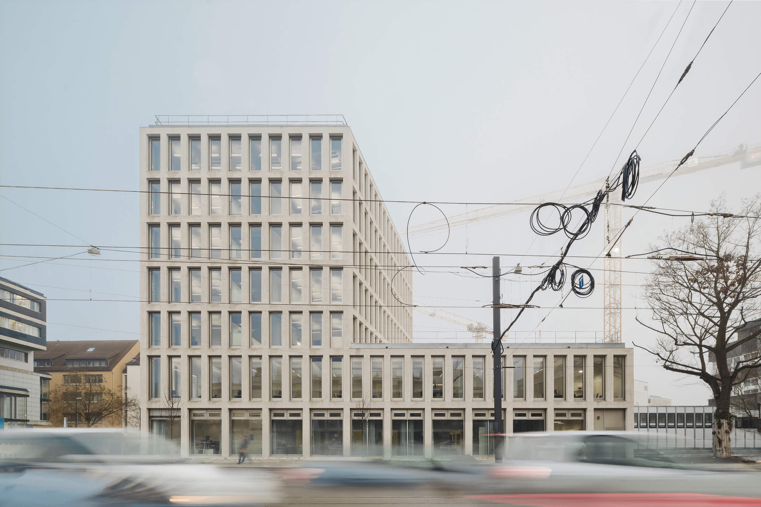 Rising above a two-storey base, a five-storey tower arranges itself concisely in the silhouette of public buildings along Olgastrasse. The light gray, stringent in-situ concrete façade grid has been manually bush-hammered on its whole surface by a stonemason, the edges along the window apertures were chared. Thus the beige coloured Jura stone (also called “Ulm white”), used as a concrete aggregate, was exposed on the concrete’s surface and gives the façade a valuable appearance and a regional focus.