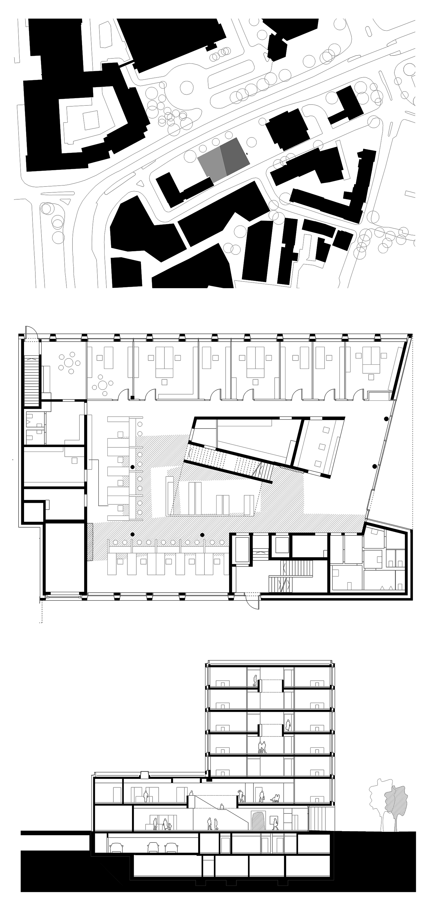 The new construction of the Citizen Service Center of the City of Ulm brings together municipal services spread over several sites in one structure, making it the “second town hall” of the city. The building is located only a few metres away from Ulm Main Station, on Olgastrasse, a busy street which traces the perimeter of the medieval city wall.