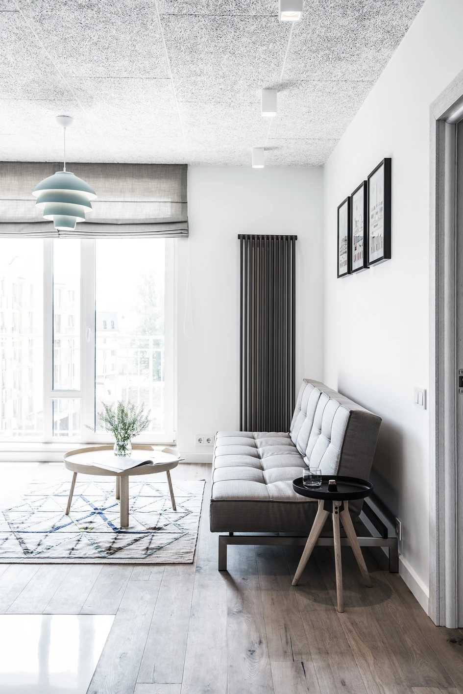 Initial meeting with the clients identified that light, simple and clear interior was needed. Therefore, modern minimalism with a touch of retro elements (such as wall radiator, central living room light fixture, side tables, etc.) was chosen.