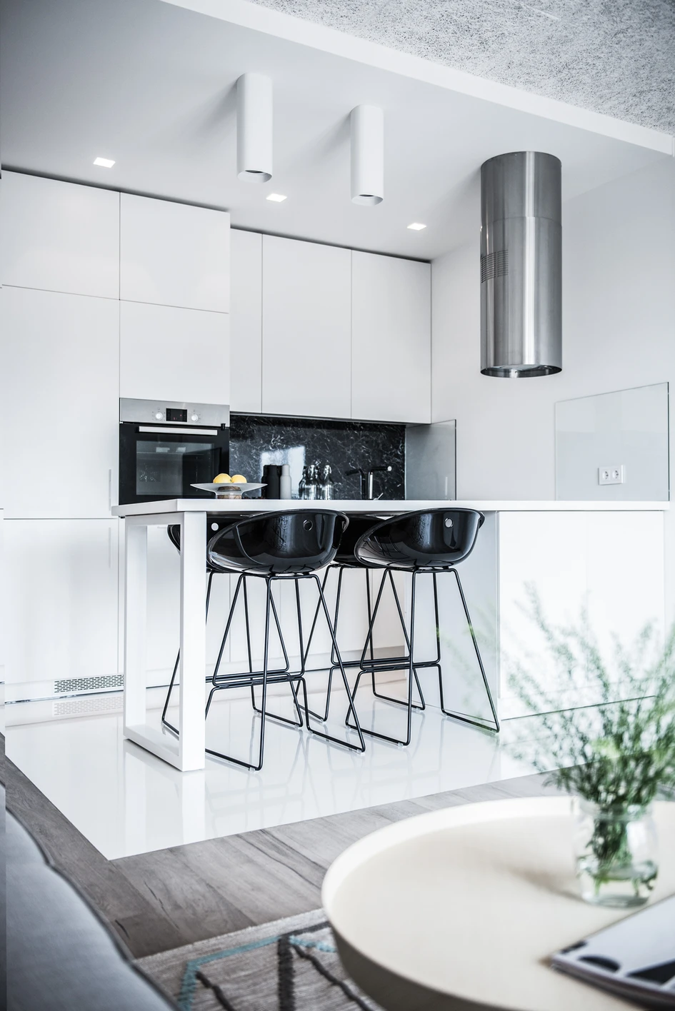 The apartment had a particularly low ceiling that suppressed the space visually, thus black and grey tones were chosen to go with the white-based interior. In order to soften the space rustic bleached oak parquet was selected to go with the epoxy flooring. Bathroom has the waterproof paint finish and was left tiles free in order to maintain the integrity.