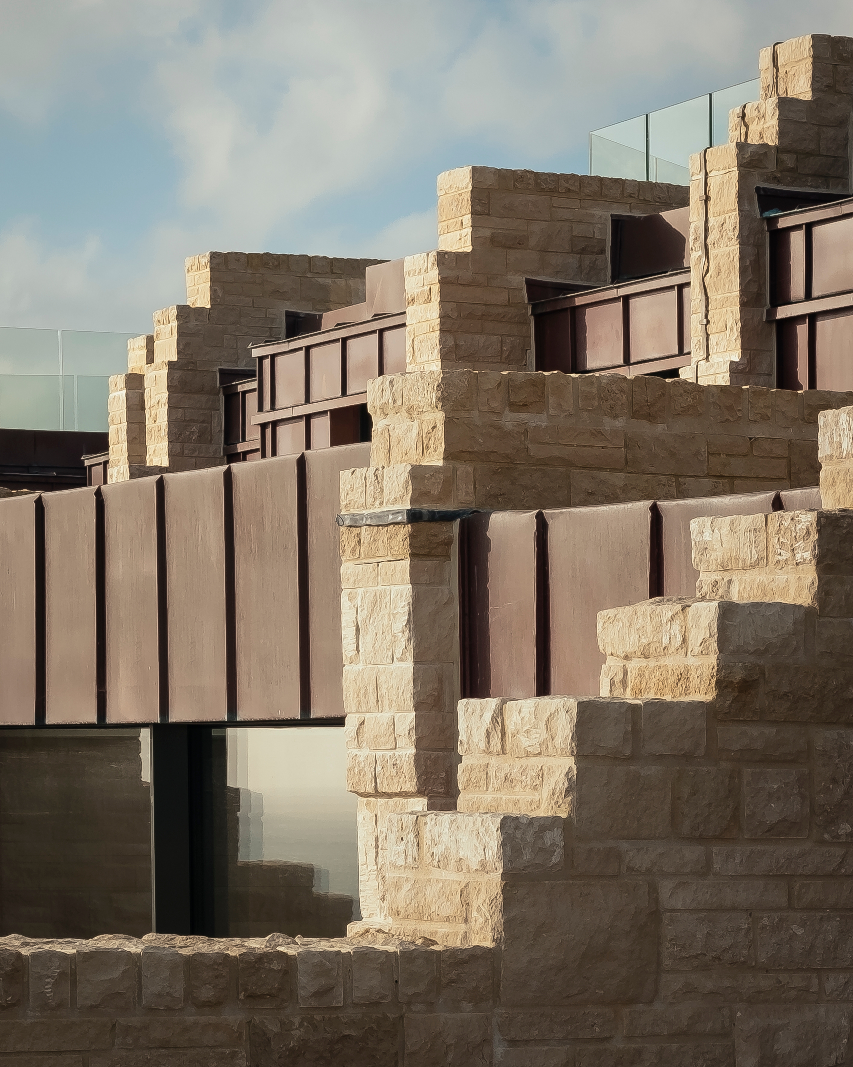 As such, the lodges are set into the rugged cliff by large, rough-cleaved blocks of local Portland’s Albion stone. Indigenous to Portland, the stone is the most natural choice; cut only minutes away from the Pennsylvania Estate, it anchors the architecture to its locale, yields a low carbon footprint and is long lasting.