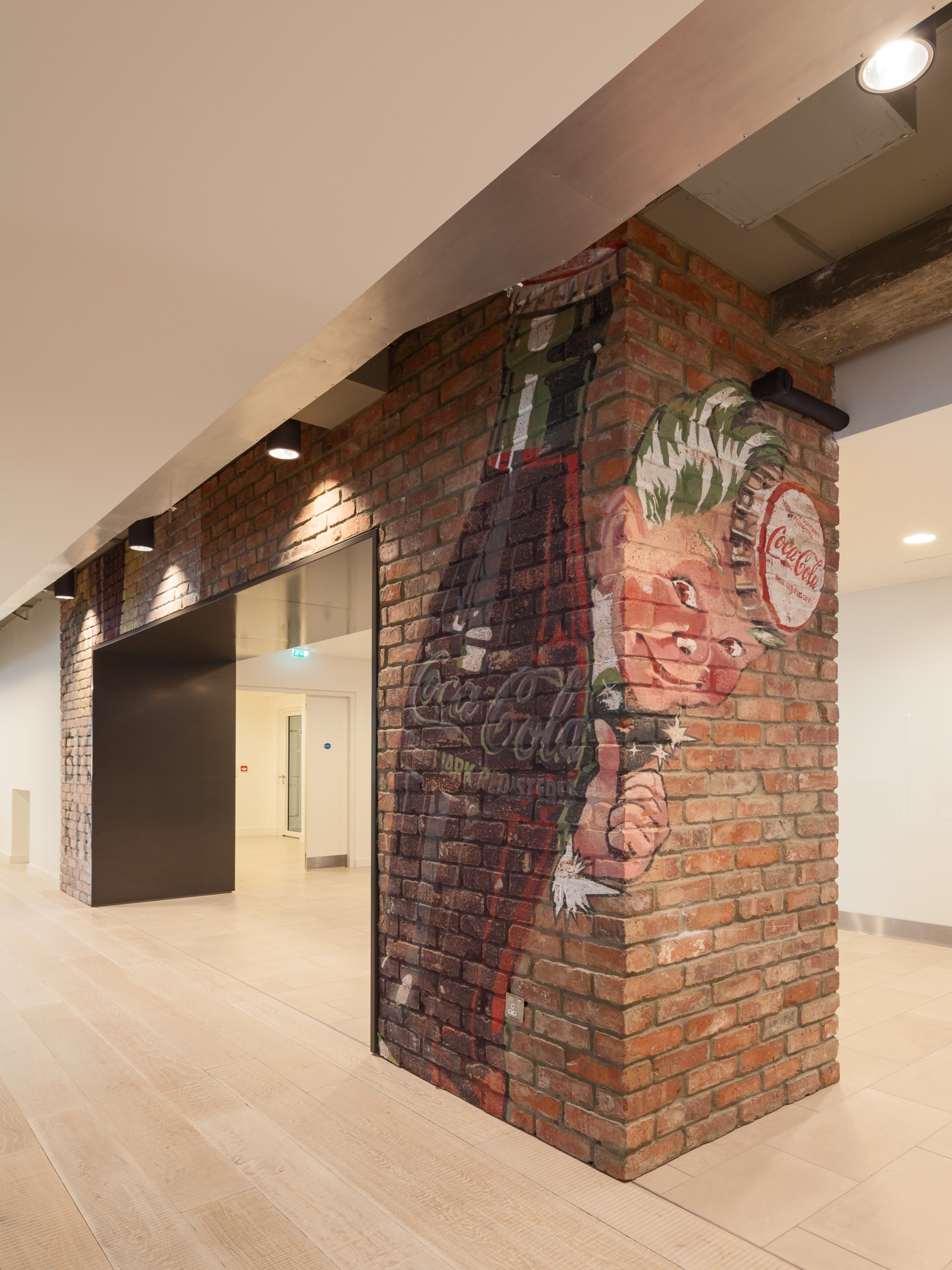 Greeting visitors at the entrance to No. 1 Wimpole Street, WC1, is one of many artworks designed by acrylicize in collaboration with MoreySmith - a large- scale Coca-Cola disc mural, painted by a master team of traditional sign writers from the USA and UK. The team used original Coca-Cola artwork, ‘pounce’ techniques, and even followed the sign- writing guidelines issued in the 1930s to create an accurate reproduction of vintage Coca-Cola symbols across each level of the building. Signs including the Sprite character are intentionally faded and cropped out to mimic the look and feel of the originals.