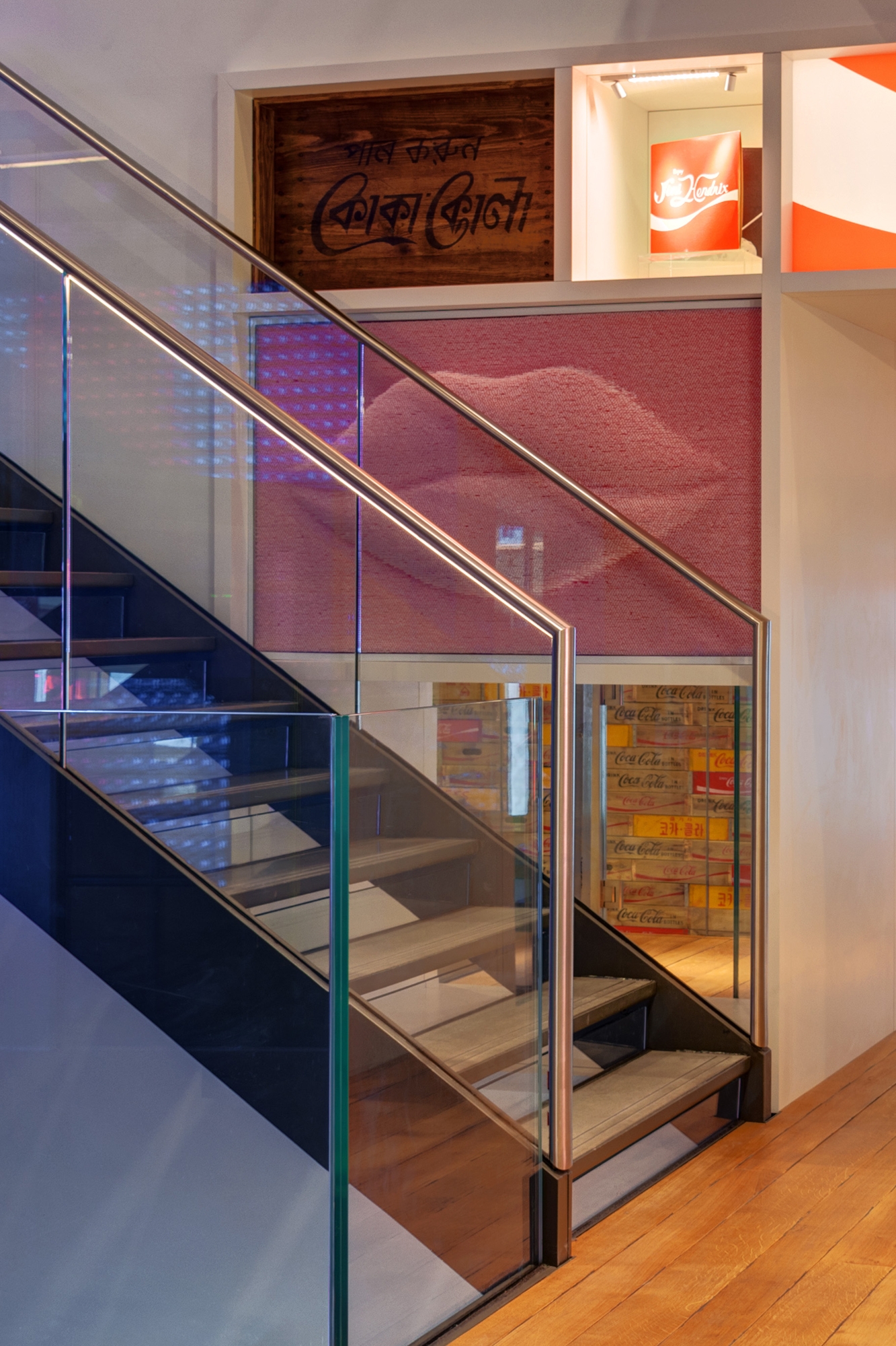 A bespoke intelligent LED screen, made up of 5,000 recycled Coca-Cola bottles, also forms part of the feature wall. With a screen on each floor, each can run independently or form one giant screen that runs the length of the three floors, displaying a series of bespoke themed visuals designed by acrylicize.