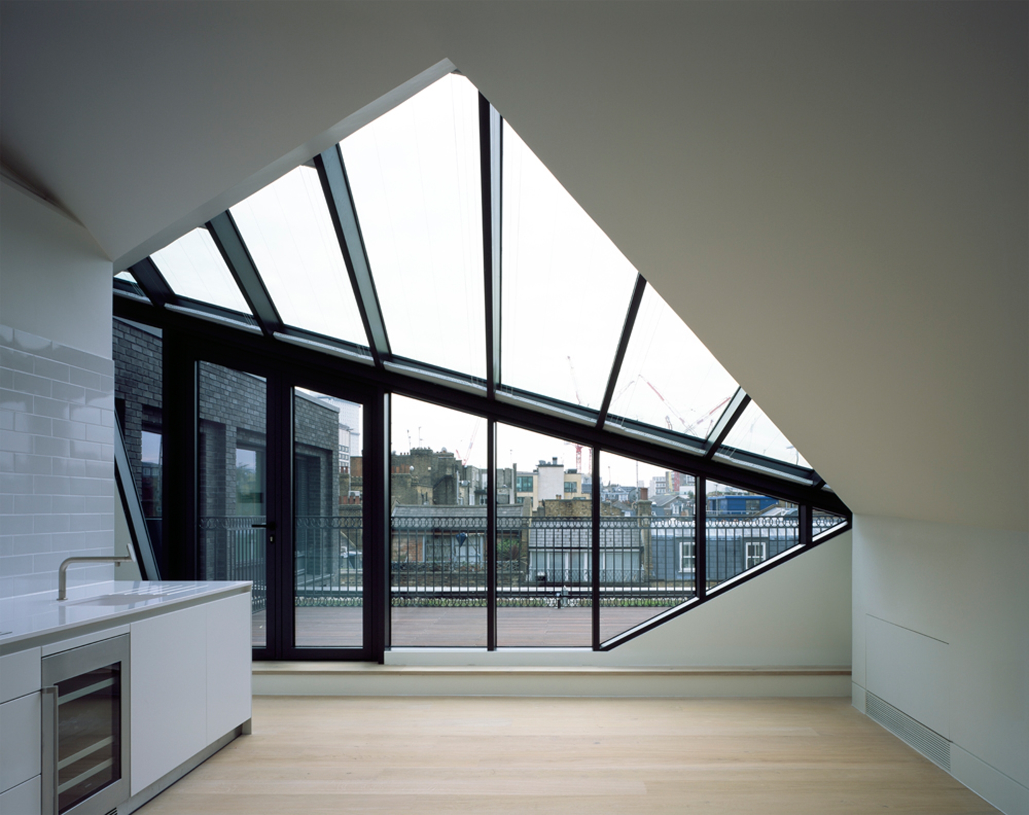 Corner House strives to introduce a new type of contemporary beauty, one which is less ostentatious yet captivating, building on the qualities of its location to provide a highly sustainable solution that embodies high quality design and craftsmanship. While at an urban level it celebrates the ordinary street corner, Corner House inverts this typology (typically presenting a more articulated treatment of the façade at the ground level) and places two jewel like crystalline pavilions on the rooftop, opening up a series of unexpected views onto Londonʼs variegated and ever changing roofscape.