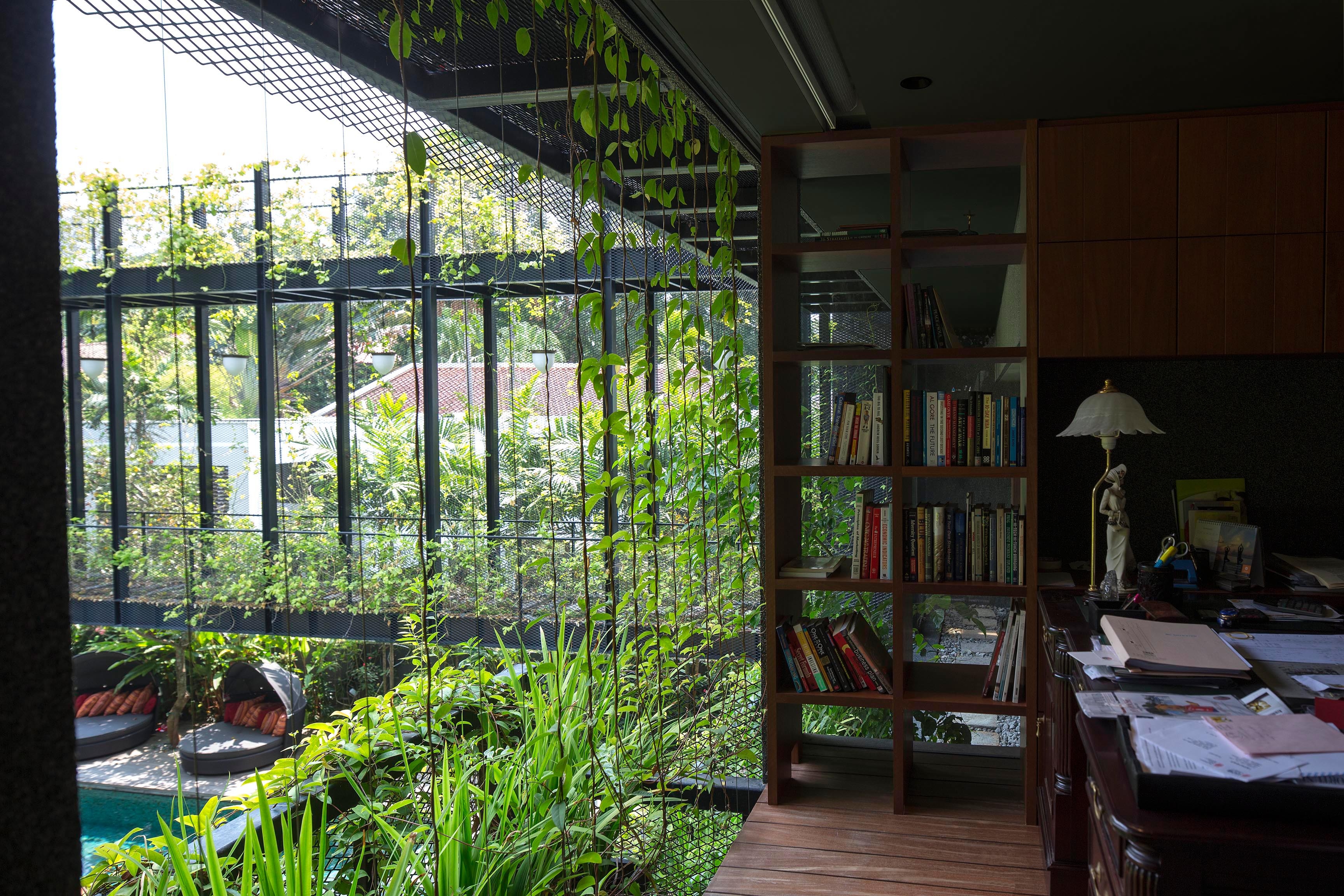 Planting verandahs of varying plant species line the peripheries of the rooms and overlook the central pool. This continues to form a planter bridge of passion fruits, where climbing vines provide sun-shade from the setting sun, and a privacy screen for the neighbours.