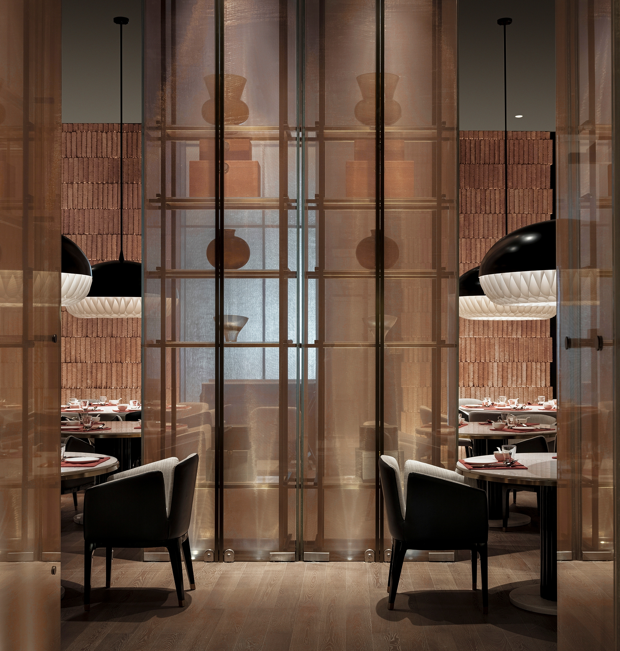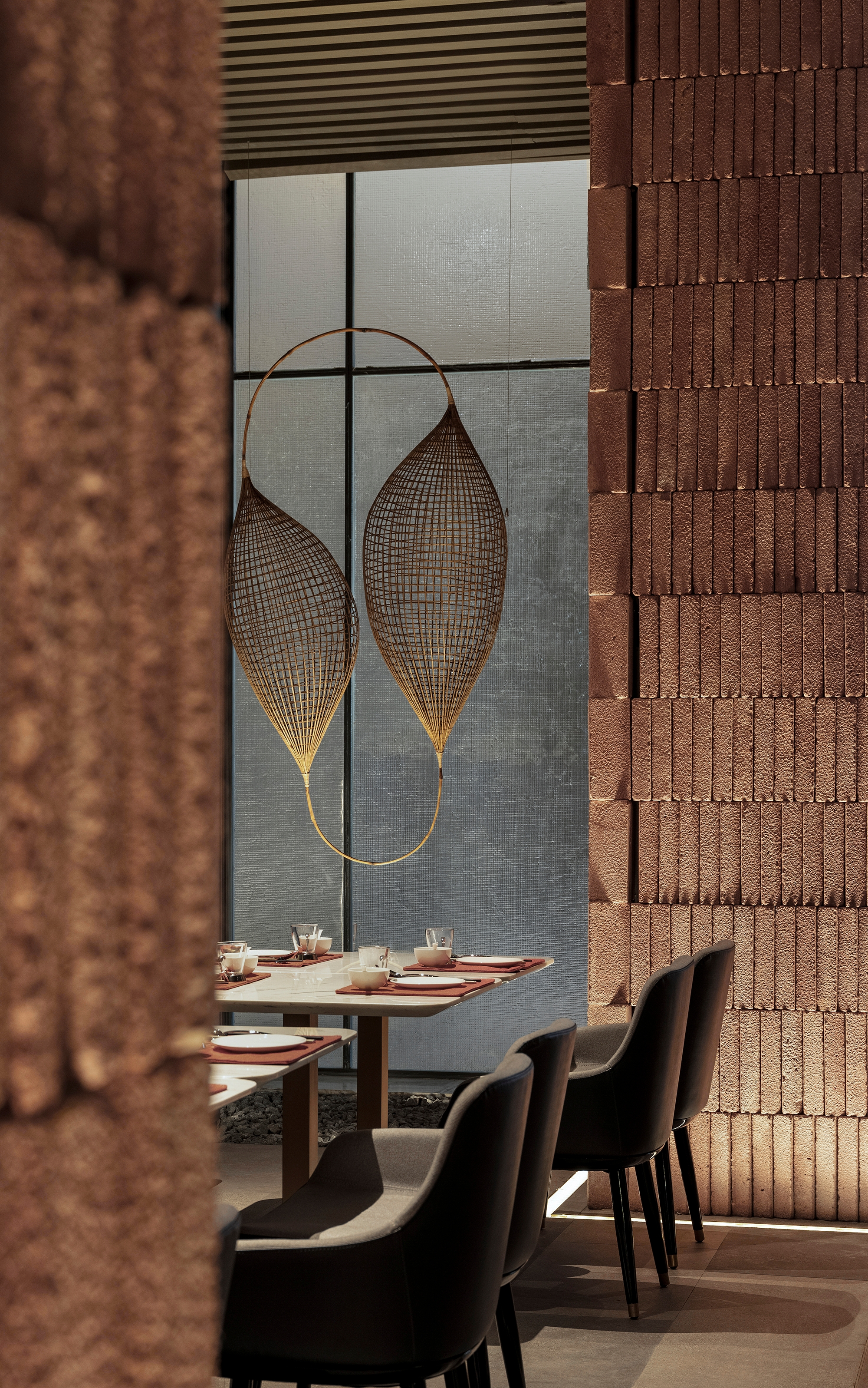 The Chinese restaurant is ebullient and lively. Red bricks made of fired clay feature a simple, warm tone, which contrasts with translucent acrylic and round pendant lighting fixtures above dining tables, together rendering a modern aesthetic. Gauze-like screens reveal scenes indistinctly, integrate the real and the virtual, and allow guests to immerse themselves in a fabulous dining atmosphere. The meticulous interior design injects infinite vitality into the austere bricks, while the interplay of light and shadows enriches the expressions of the space.