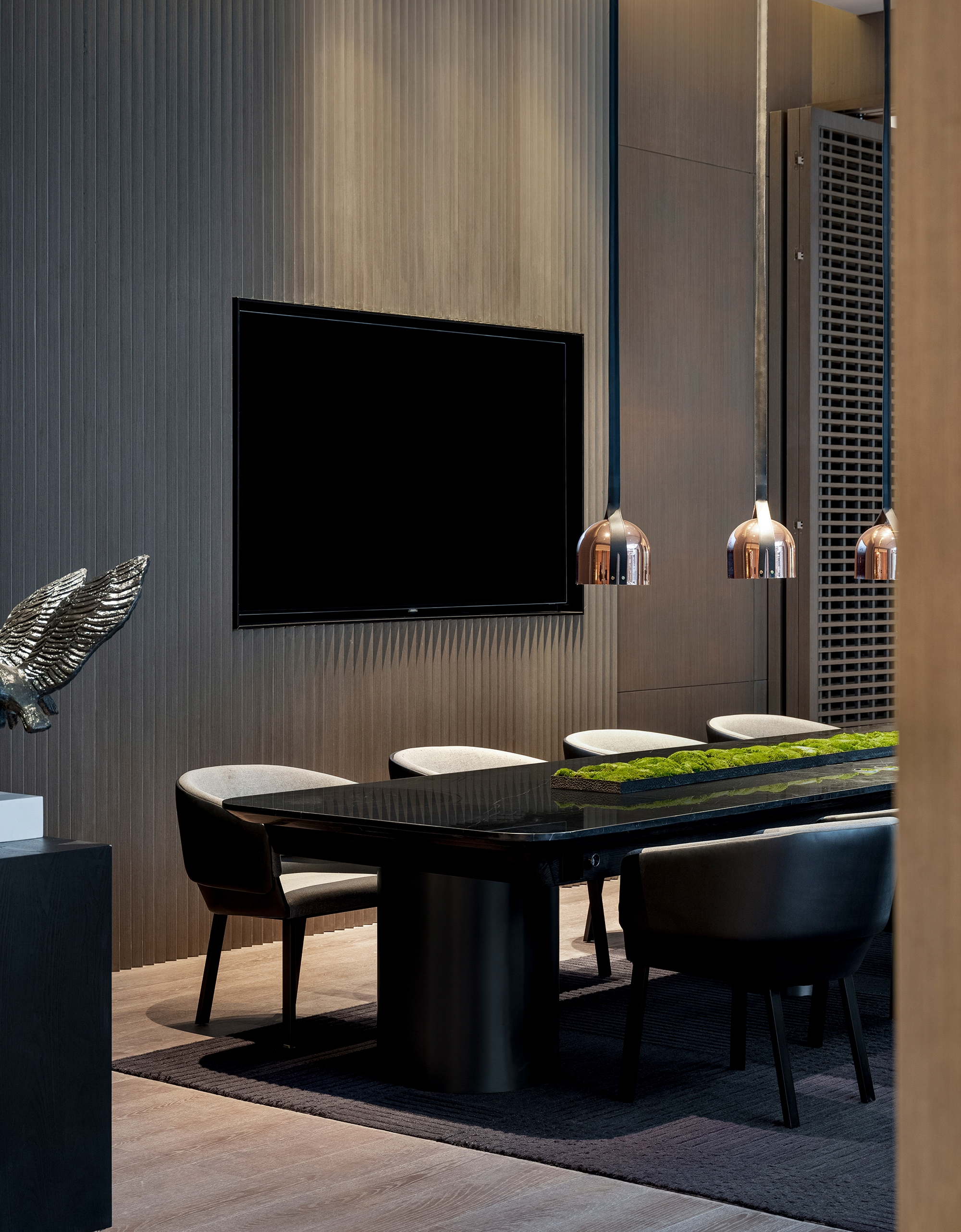 The simplistic and neat lobby incorporates subtle design ideas. The intersecting of transparent acrylic strips and timber conveys the designers' understanding on modern business elites' life, which embraces infinite possibilities. Their life is not a straight line. It's the interweaving of work, daily life, interpersonal relationship and family, etc. that contribute to their wonderful life.