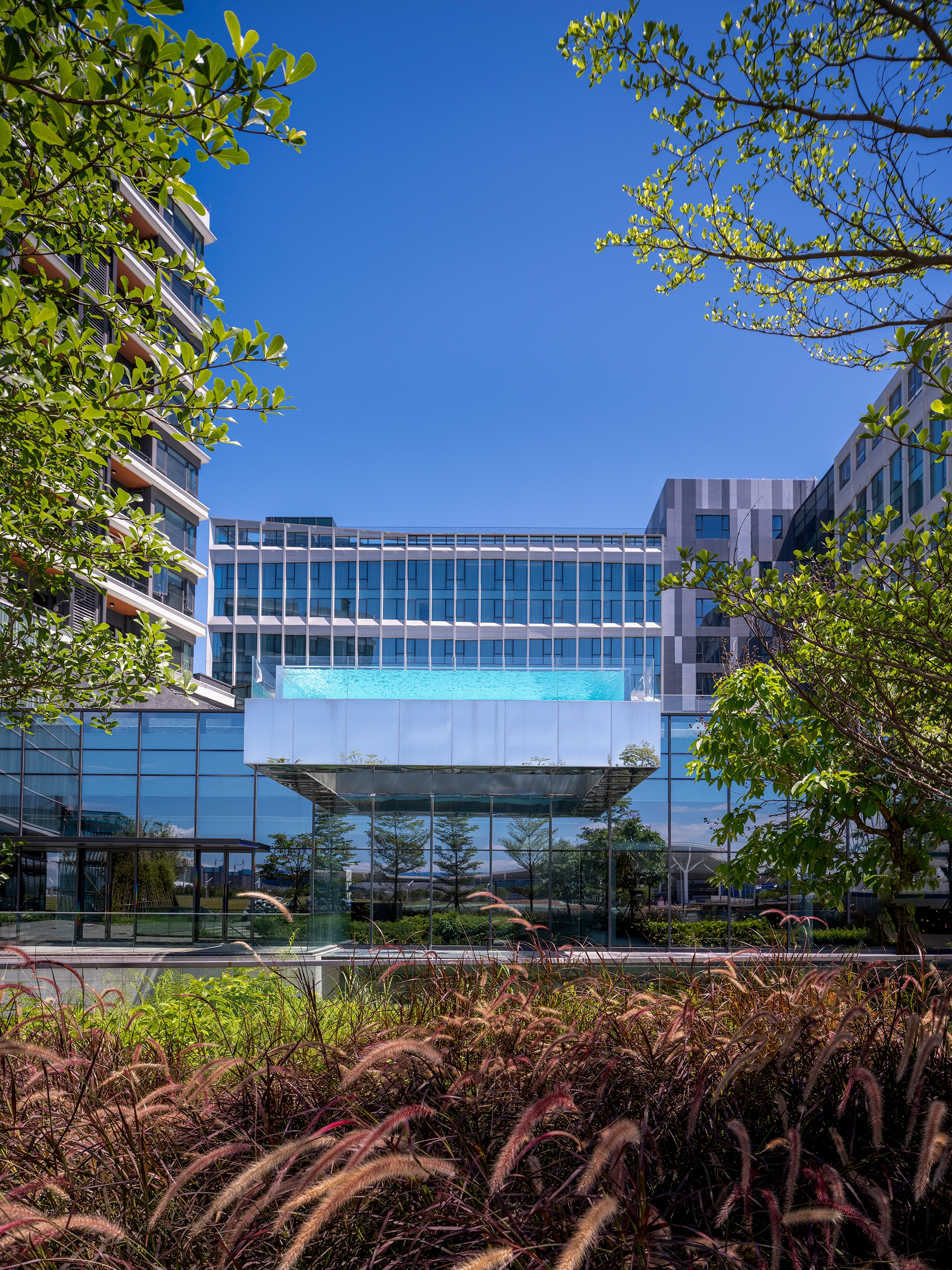 The hotel is highlighted by a suspended infinity swimming pool, which is the first one of its kind in China and gives a first impression of the cool coastal city. The creative combination of contrasting materials and elements, including solid cement walls, transparent glass, soft water and warm sunlight, produces unexpected effects.