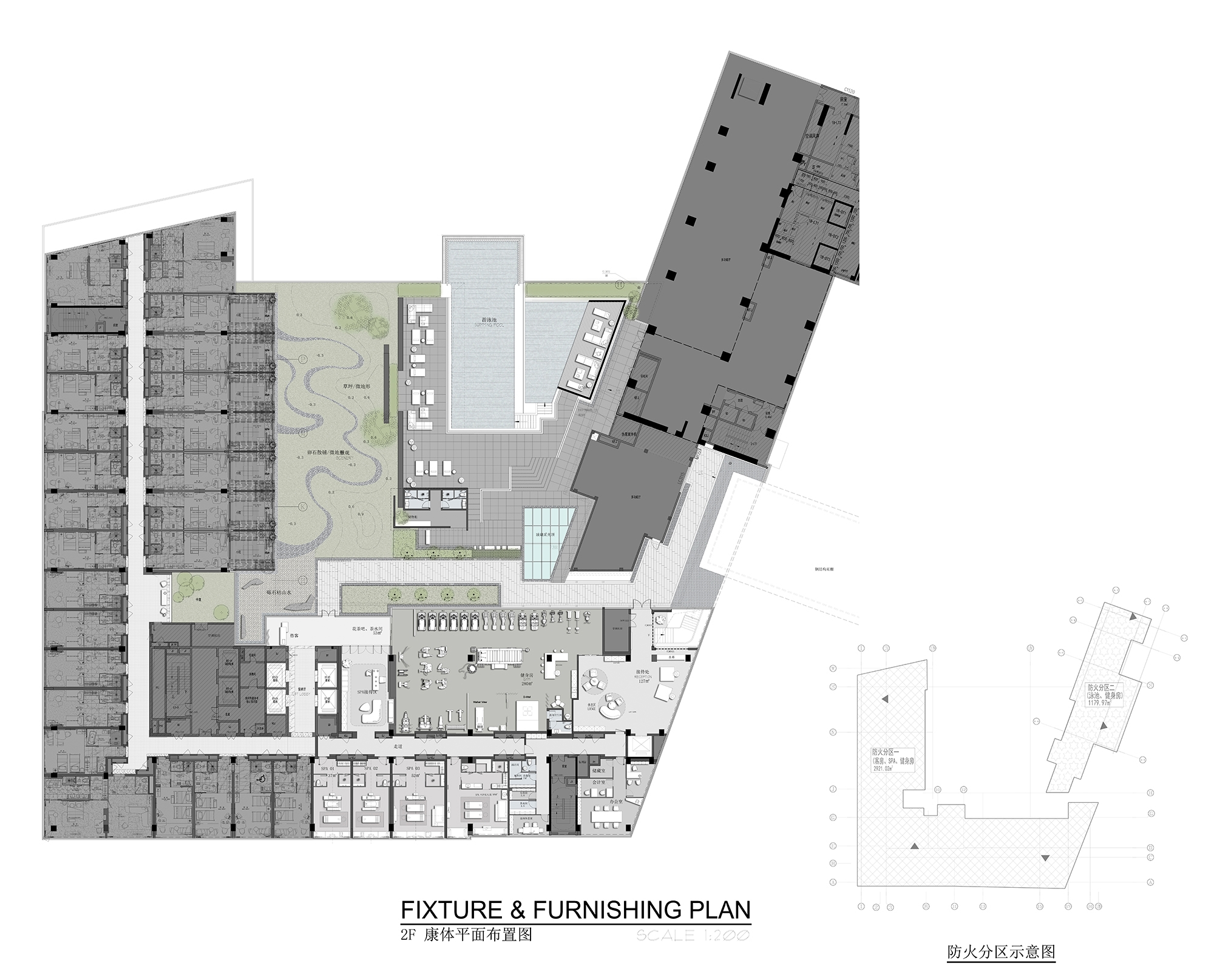 The entrance canopy features 5-meter-high water curtains, which greet guests with a cool and refreshing atmosphere. As night falls and the temperature goes down, the canopy area is illuminated by lighting, which creates charming and unique visual experiences. The entrance appears indistinctly and keeps a low profile, which embodies oriental Zen atmosphere and helps relieve the fatigue in business trips.