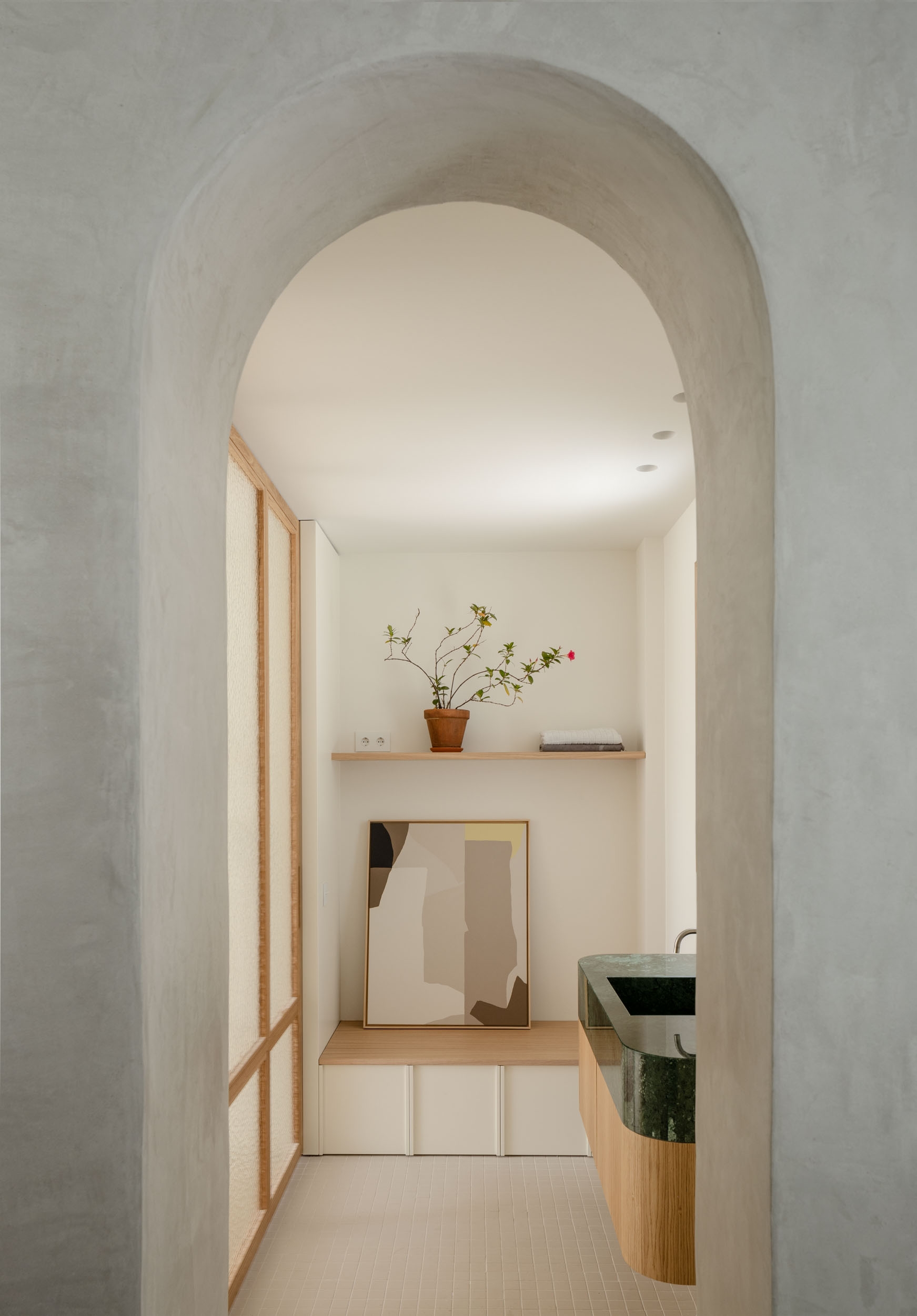Special attention has been paid to the choice of materials and the design of each integrated furniture element. Natural materials and neutral colors have been chosen to achieve a sense of calm inside the house. The aim is to create an interior that invites reflection and is luminous. The flooring, doors and furniture are made of American white oak. Tadelak has been used to cover the showers and ceramic tiles for the flooring in the wet areas. The washbasins, designed by our studio, are made of terrazzo or marble