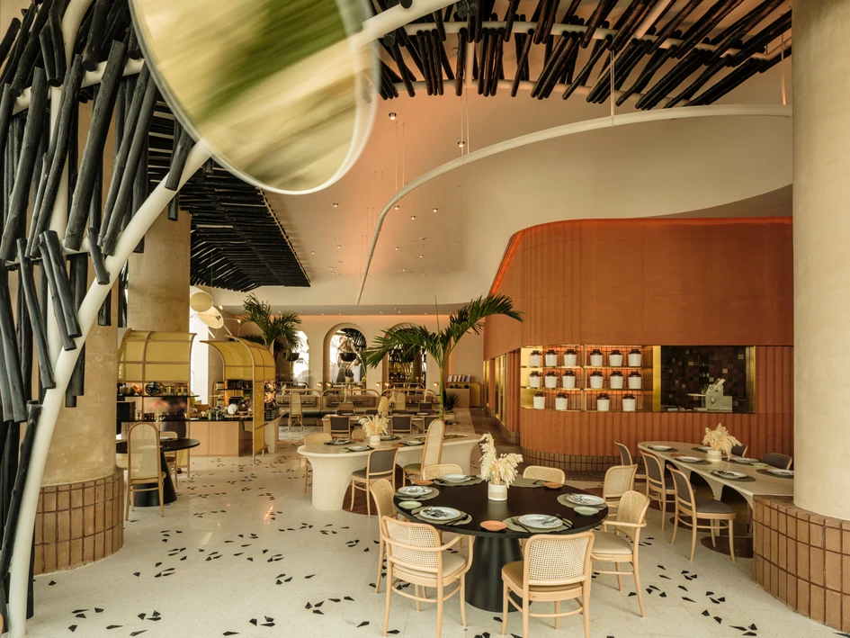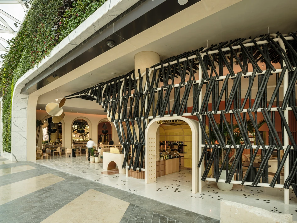 Due to the restaurant’s location within an air conditioned mall, the entire store front was left open allowing for a direct visual connection between diners and shoppers. A secondary layer of an unraveled dome structure encased with a double layer of charred Indian sandalwood logs (locally known as Chan’dal - and typically used as structural beams in traditional houses) This is one of the direct correlations between the two locations, the central dome in the flagship and the unraveled dome acting as the barrier between the mall and the restaurant’s interior in the new branch.