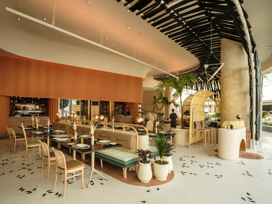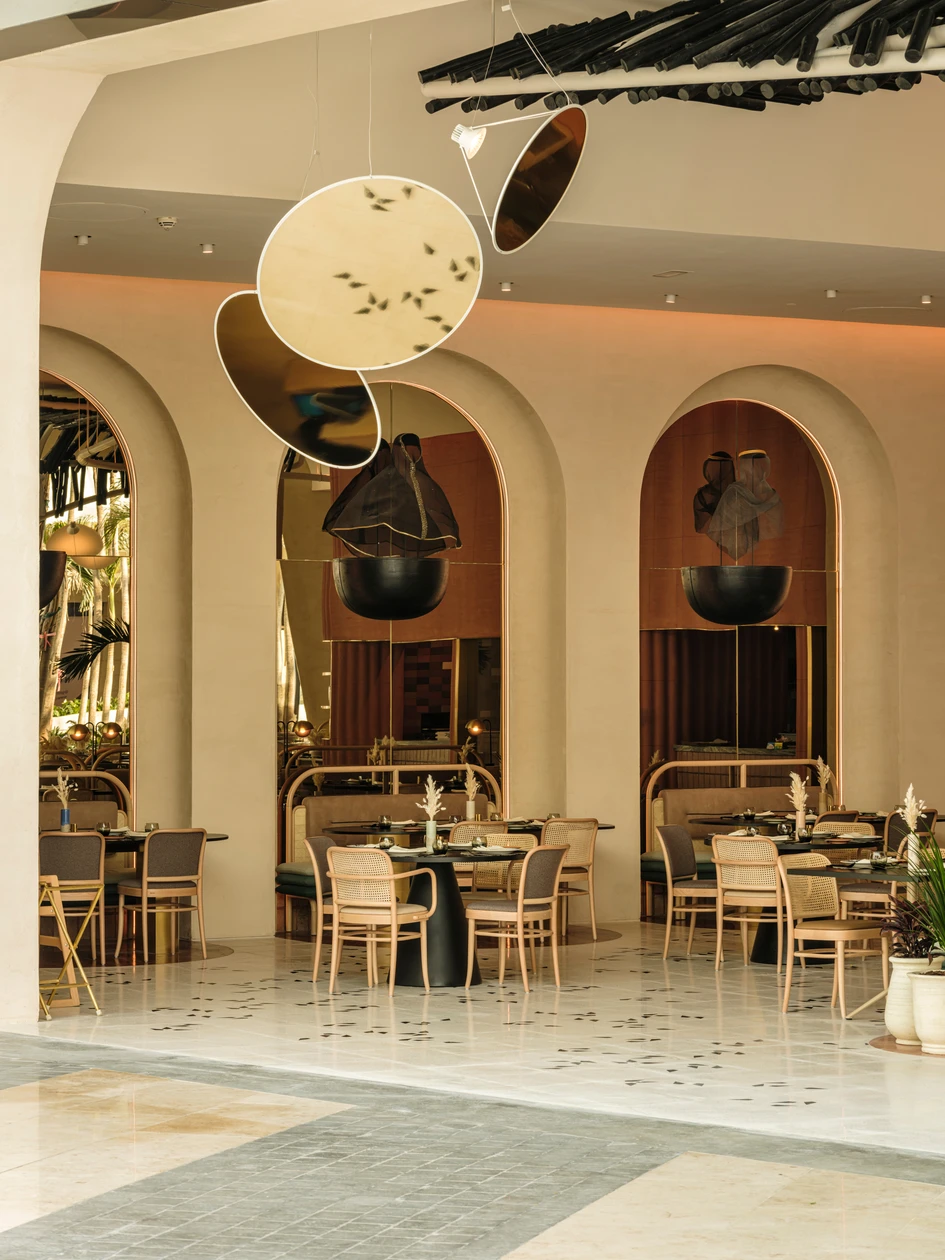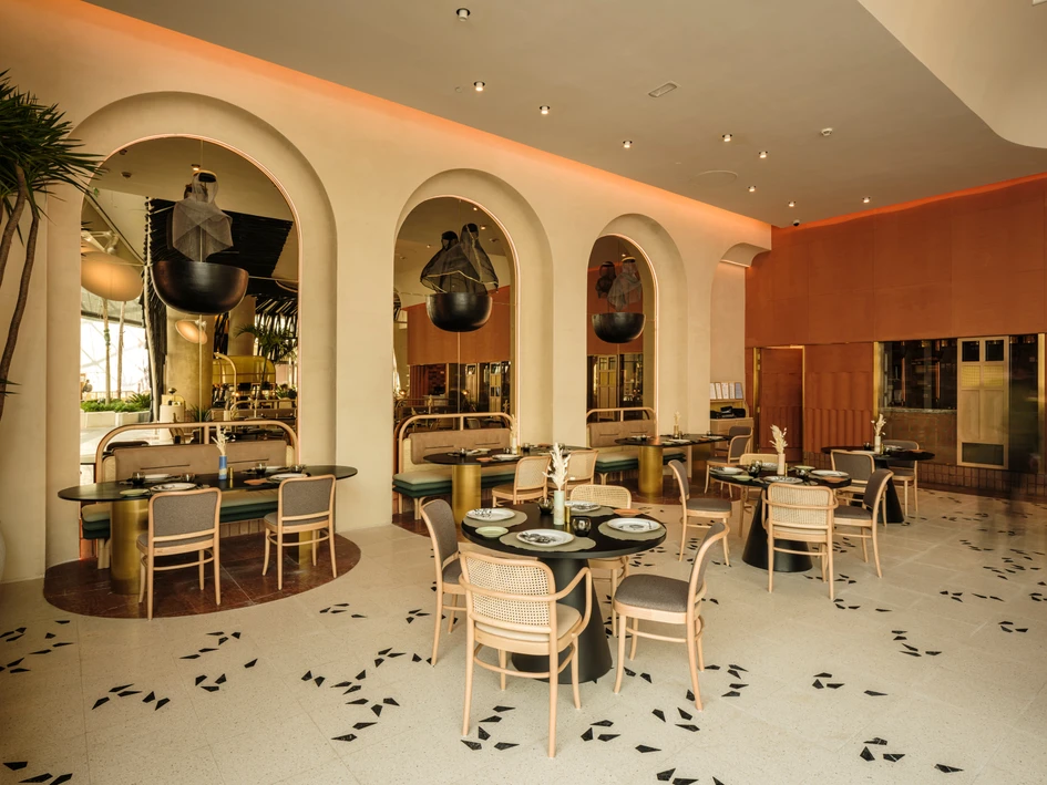 The dining space is defined by four fixed seating zones, three of which feature monolithic marble tables with gypsum bases, the bases are punctured with various half circular openings to lighten the visual weight of the tables. The array of seating ends with a focal wall featuring three arched niches with a mirror backing, this along with the reflective golden disks in the ceiling pendants showcase various reflections of the space.