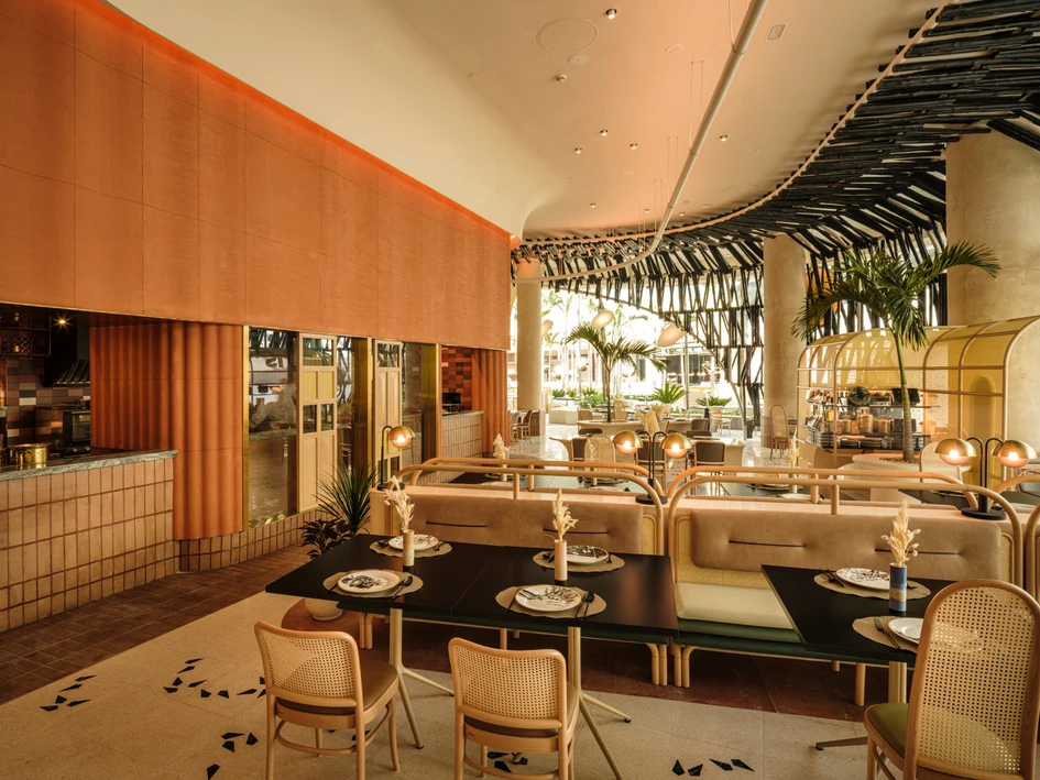 The terrazzo flooring is dusted with black marble inserts cut in diamond shapes, the same tile cut used in the flagship’s private dining rooms. The undulating kitchen wall is grounded with a brick skirting that folds into the floor, indirectly marking the service circulation space within the dining area. Rattan is used throughout the space, from an insert in the wooden panels acting as a backdrop to the reception and to the furniture and counters.